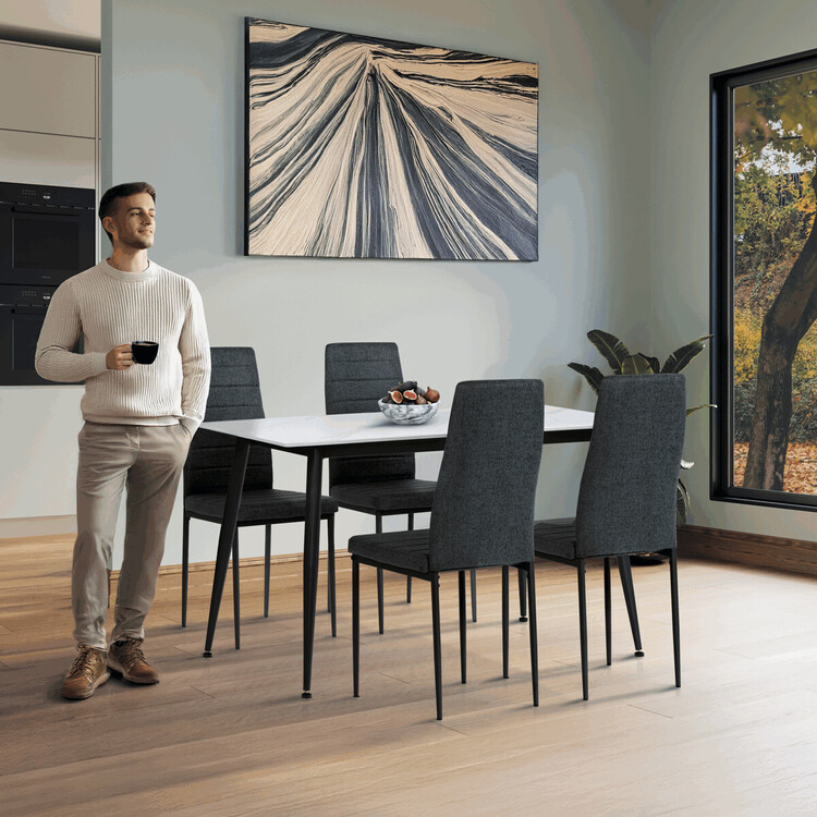 Moderní jídelní set Autronic v industriálním stylu je skvělou volbou pro vaši jídelnu. Obdélníkový stůl s deskou ze slinuté keramiky v bílém mramorovém dekoru působí elegantně a je odolný vůči poškrábání. Stabilitu zajišťují černé kovové nohy s jemně kónickým tvarem. Pohodlné židle mají čalounění z hladké černé látky a ergonomicky tvarovanou opěrku pro maximální komfort. Černé kovové nohy ladí se stolem a dodávají celku jednotný vzhled. Ideální volba pro stylové a funkční stolování.