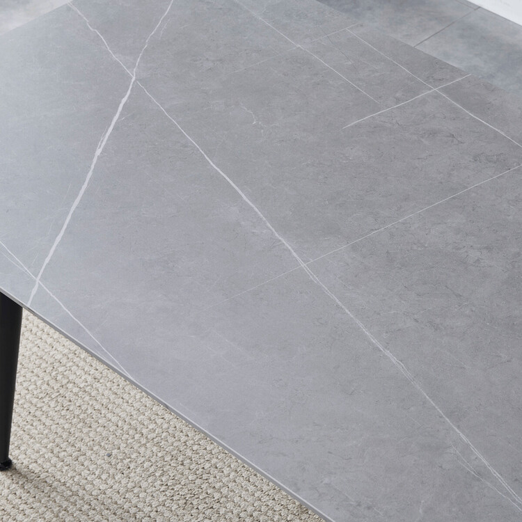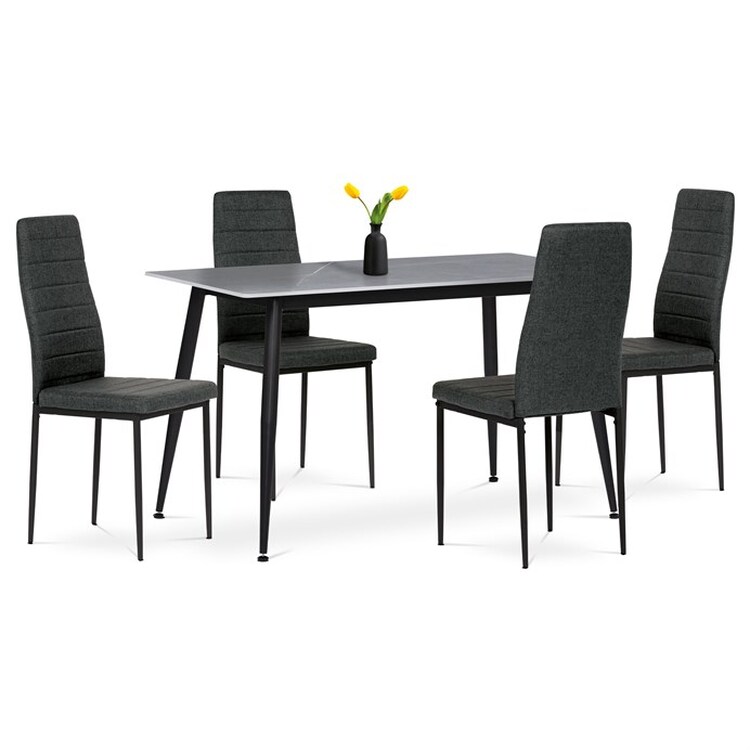 Moderní jídelní set Autronic v industriálním stylu je skvělou volbou pro vaši jídelnu. Obdélníkový stůl s deskou ze slinuté keramiky v šedém mramorovém dekoru působí elegantně a je odolný vůči poškrábání. Stabilitu zajišťují černé kovové nohy s jemně kónickým tvarem. Pohodlné židle mají čalounění z hladké černé látky a ergonomicky tvarovanou opěrku pro maximální komfort. Černé kovové nohy ladí se stolem a dodávají celku jednotný vzhled. Ideální volba pro stylové a funkční stolování.