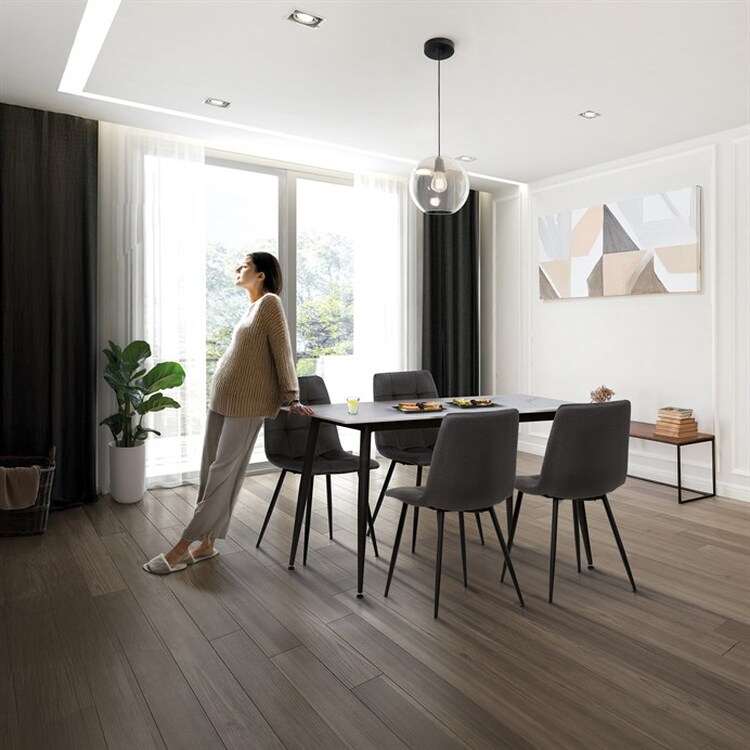 Jídelní set 1+4 kombinuje moderní design s praktickým provedením vhodným pro každodenní použití. Stůl o rozměrech 130×80 cm je vybaven deskou z kvalitní slinuté keramiky s bílým mramorovým dekorem, která je odolná vůči poškrábání a snadno se udržuje. Černá kovová podnož stolu zajišťuje stabilitu a pevnost celé sestavy. Čtyři židle jsou čalouněné šedou látkou s designovým prošitím na opěradle, které dodává celku elegantní a současný vzhled. Židle mají kovové nohy v černé barvě, které doplňují celkový minimalistický styl a poskytují dostatečnou nosnost pro běžné použití.