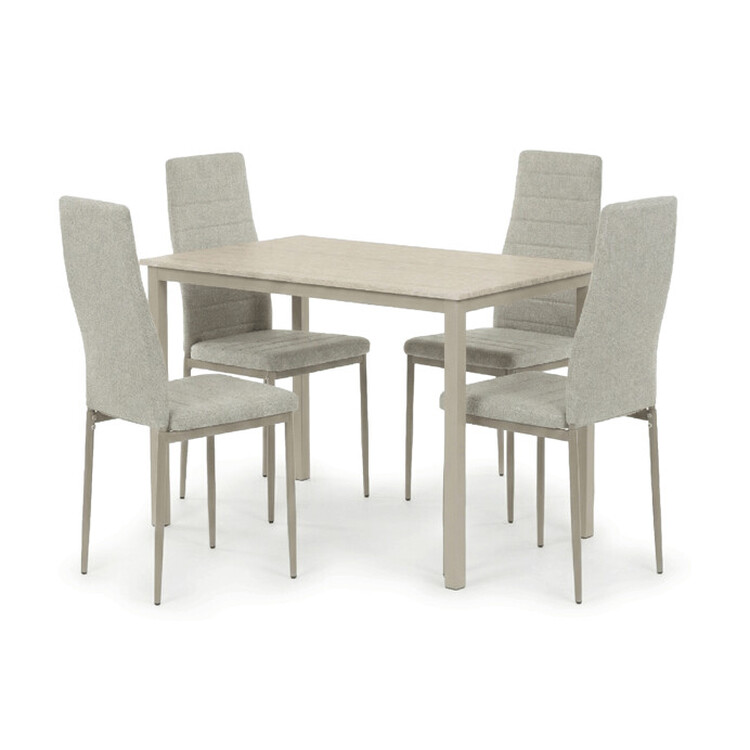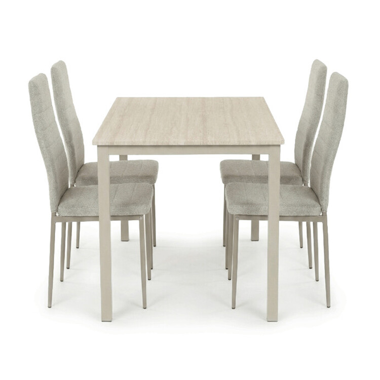 Jídelní set 1+4 kombinuje praktický stůl s rozměry 110×70×75 cm a čtyři pohodlné židle v krémovém odstínu. Deska stolu je vyrobena z MDF s dekorativním povrchem v odstínu travertinu, který napodobuje přírodní kámen a snadno se udržuje. Stabilní kovové nohy stolu v barvě cashmere zajišťují... více informací o zboží