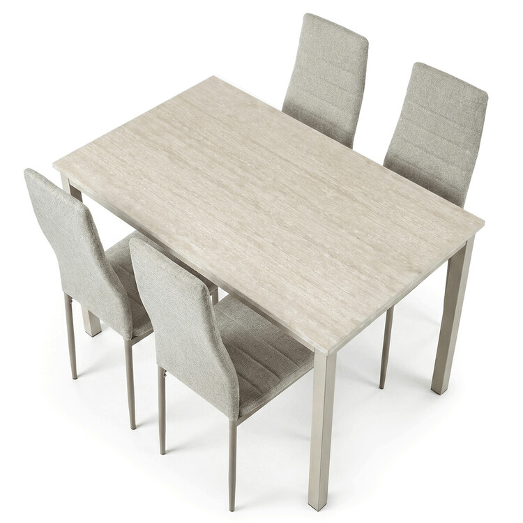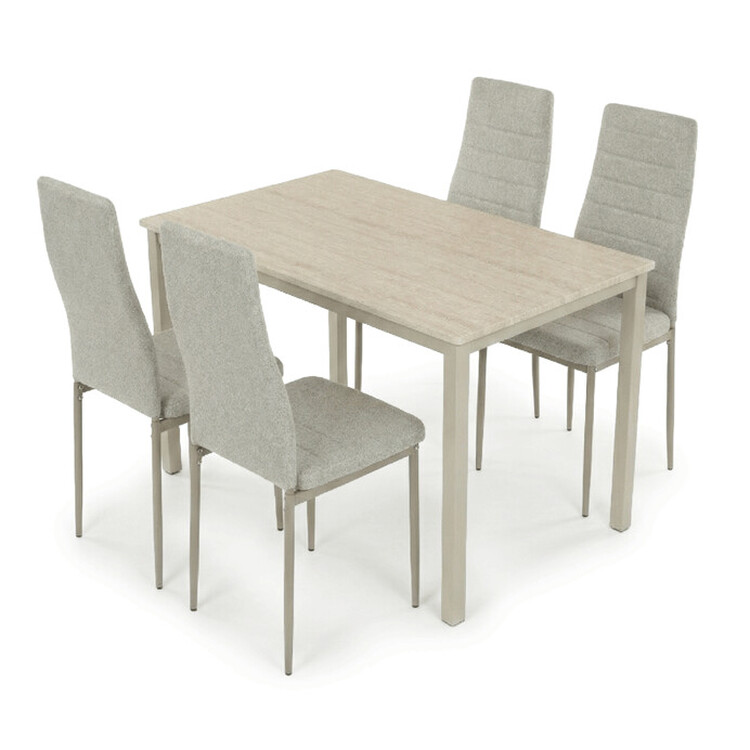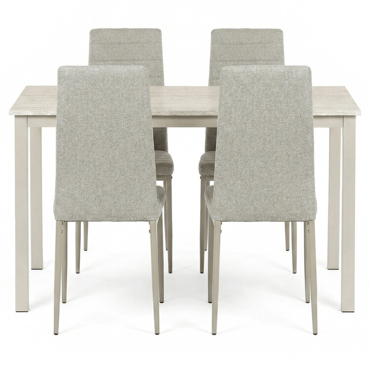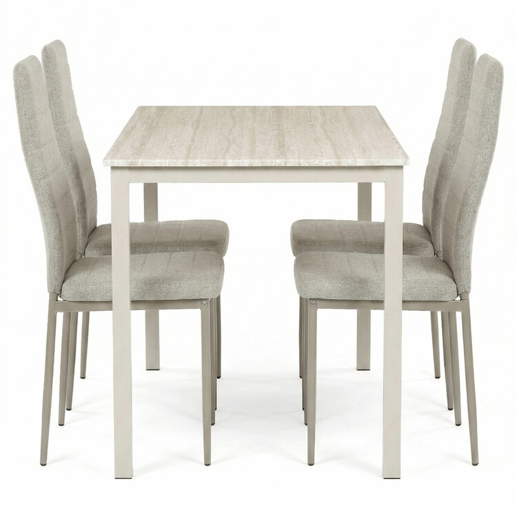 Jídelní set 1+4 kombinuje praktický stůl s rozměry 110×70×75 cm a čtyři pohodlné židle v krémovém odstínu. Deska stolu je vyrobena z MDF s dekorativním povrchem v odstínu travertinu, který napodobuje přírodní kámen a snadno se udržuje. Stabilní kovové nohy stolu v barvě cashmere zajišťují pevnost a dlouhou životnost, zatímco židle mají kovovou konstrukci v cappuccino odstínu a jsou čalouněné příjemnou látkou, která podporuje komfort při sezení. Nadčasový design celého setu se hodí do různých interiérů a díky kvalitnímu zpracování je vhodný pro každodenní použití v domácnosti i menších provozech.