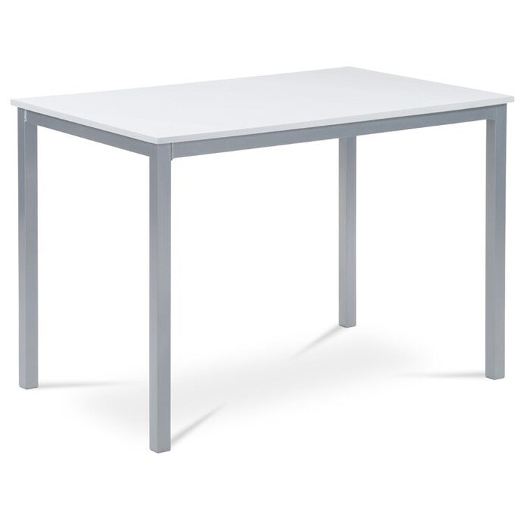 Jídelní stůl o délce 110 cm a šířce 75 cm v minimalistickém klasickém stylu. Stolní deska tl. 2 cm je z čistě bílé matné MDF obdélníkového tvaru. Nohy a konstrukce je kovových profilů čtvercového průřezu. Nohy jsou ve spodní části opatřeny plastovými záslepkami s kluzáky, zabraňující poškození podlahové krytiny. Povrchová úprava je práškovou vypalovací barvou ve stříbrnošedém odstínu.Výška stolu je 75 cm.Stůl se hodí do menších a střídně zařízených kuchyní i jídelen, svým neutrálním designem najde úspěšné uplatnění i v jiných prostorách. Dále je ho možné použít i jako psací či pracovní na lehčí činnosti, vzhledem k jeho subtilnosti. Vhodné židle jsou nejen se stejně barevnou podnoží, ale nebojte se experimentovat i se dřevem či plastem.Ke stolu je možné umístit 4 židle.