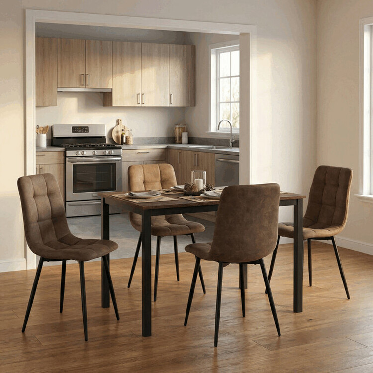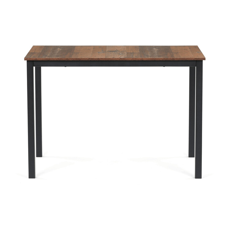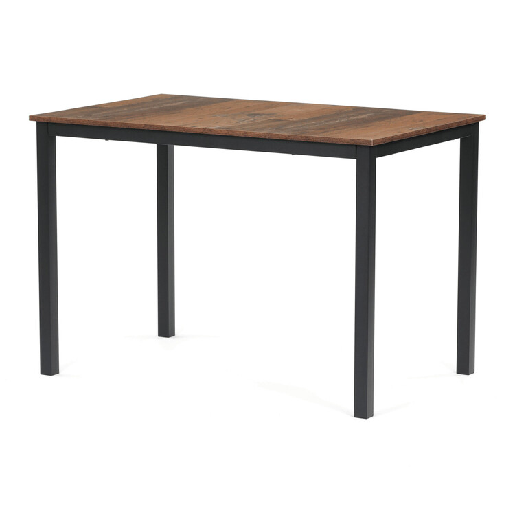 Jídelní stůl o rozměrech 110 × 70 × 75 cm kombinuje desku z MDF s dekorem starého dřeva a stabilní kovovou podnož v černém matném laku. Deska je navržena pro snadnou údržbu a odolnost vůči běžnému opotřebení, což zajišťuje dlouhodobou funkčnost v domácím i komerčním prostředí. Kovová podnož přispívá k celkové stabilitě a pevnosti stolu, zatímco minimalistický design umožňuje jeho univerzální využití v moderních i tradičních interiérech. Stůl není rozkládací, což podtrhuje jeho jednoduchost a pevnost. Díky svým rozměrům poskytuje dostatek prostoru pro pohodlné stolování či práci.