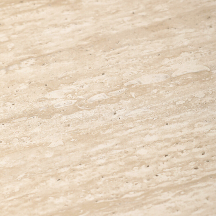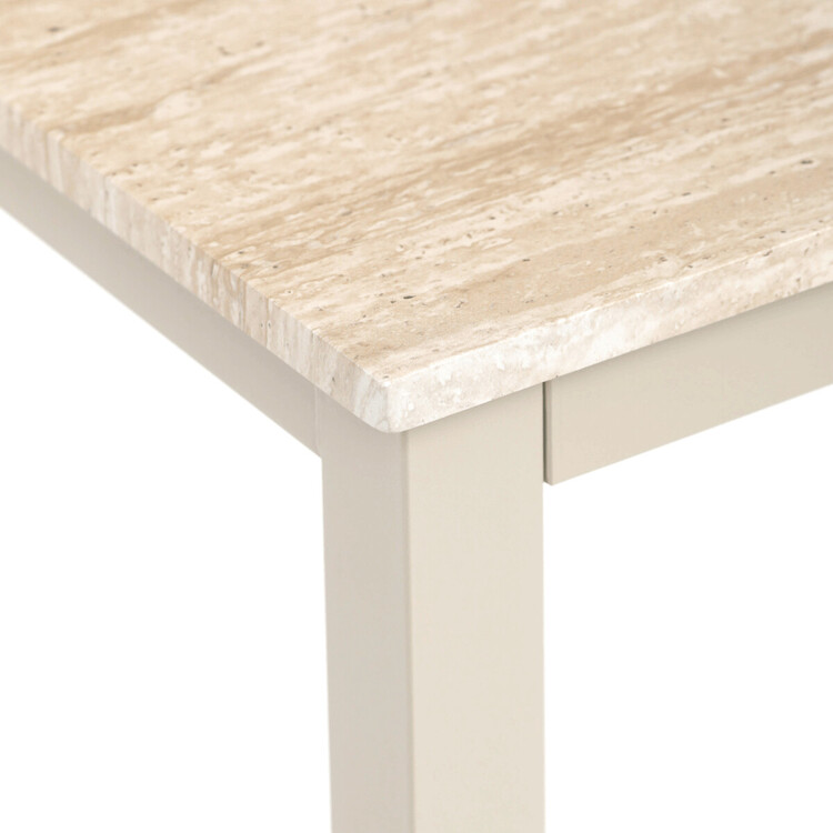 Jídelní stůl o rozměrech 110 × 70 × 75 cm kombinuje desku z MDF s dekorativním povrchem v odstínu travertinu a stabilní kovovou podnož v lakovaném cashmere provedení. Deska je opatřena matnou povrchovou úpravou, která usnadňuje údržbu a odolává běžnému opotřebení. Kovová podnož zajišťuje pevnost a stabilitu celé konstrukce, což přispívá k dlouhé životnosti stolu. Design s čistými liniemi a přírodními odstíny travertinu vytváří univerzální řešení vhodné do moderních i klasických interiérů. Stůl není rozkládací a nabízí pevnou pracovní nebo jídelní plochu s nosností odpovídající běžnému domácímu použití.