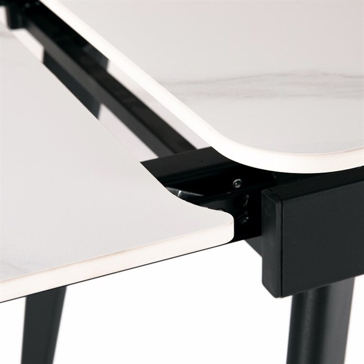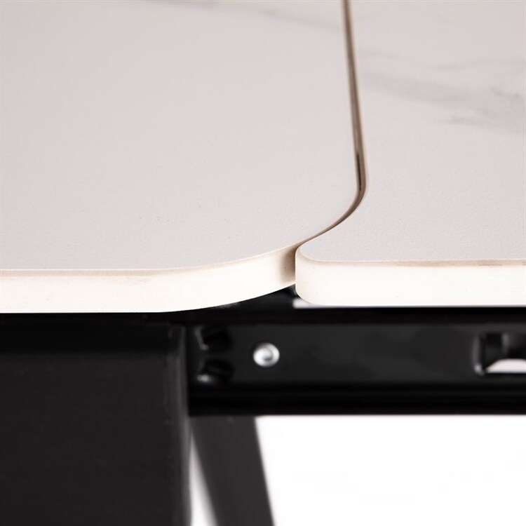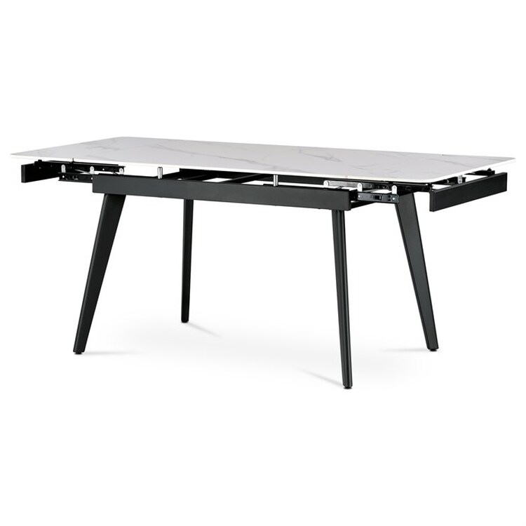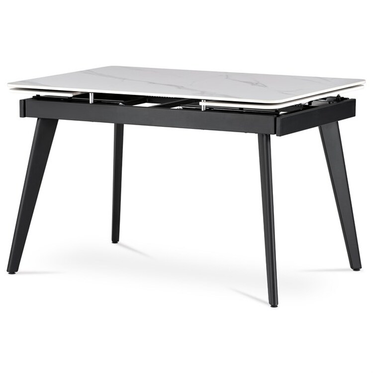 Jídelní rozkládací stůl HT-405M WT kombinuje moderní design s praktickou funkčností. Deska stolu je vyrobena z matné keramické plochy s mramorovým dekorem, která je odolná vůči poškrábání a snadno se udržuje v čistotě. Pevné kovové nohy v černé barvě zajišťují stabilitu a dlouhou životnost.... více informací o zboží