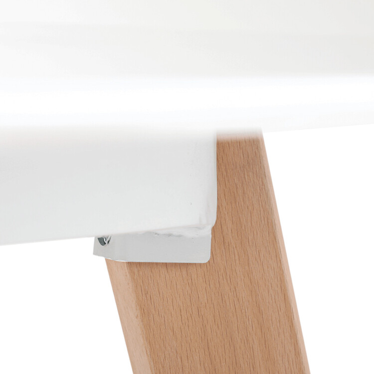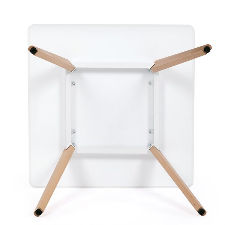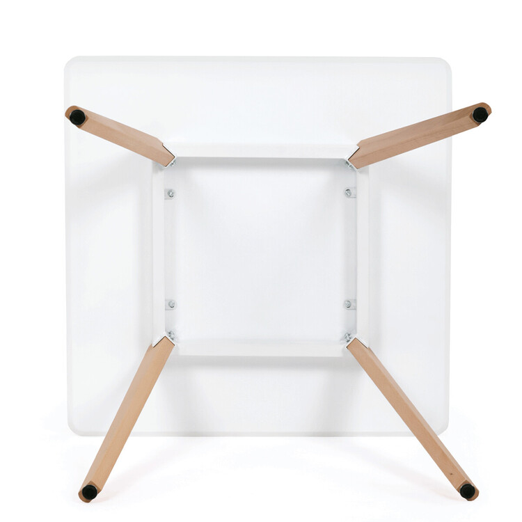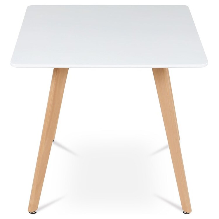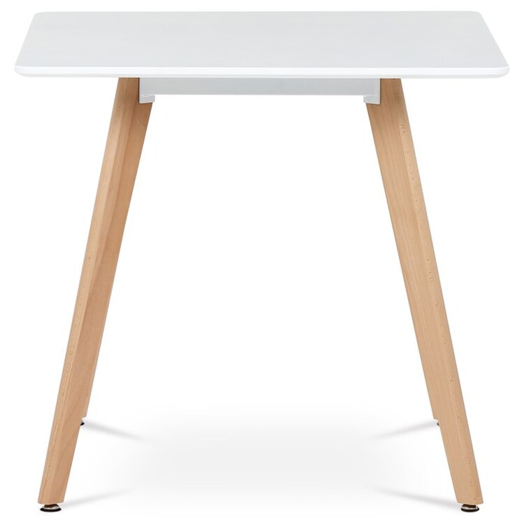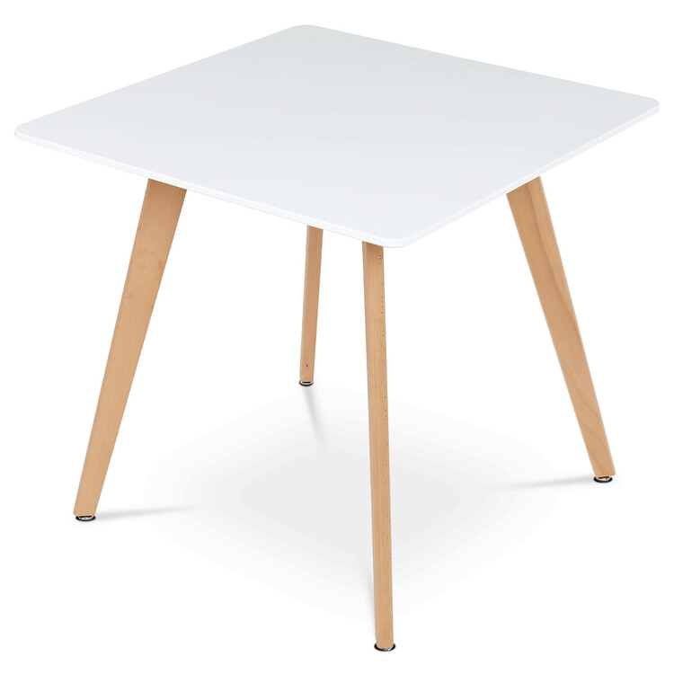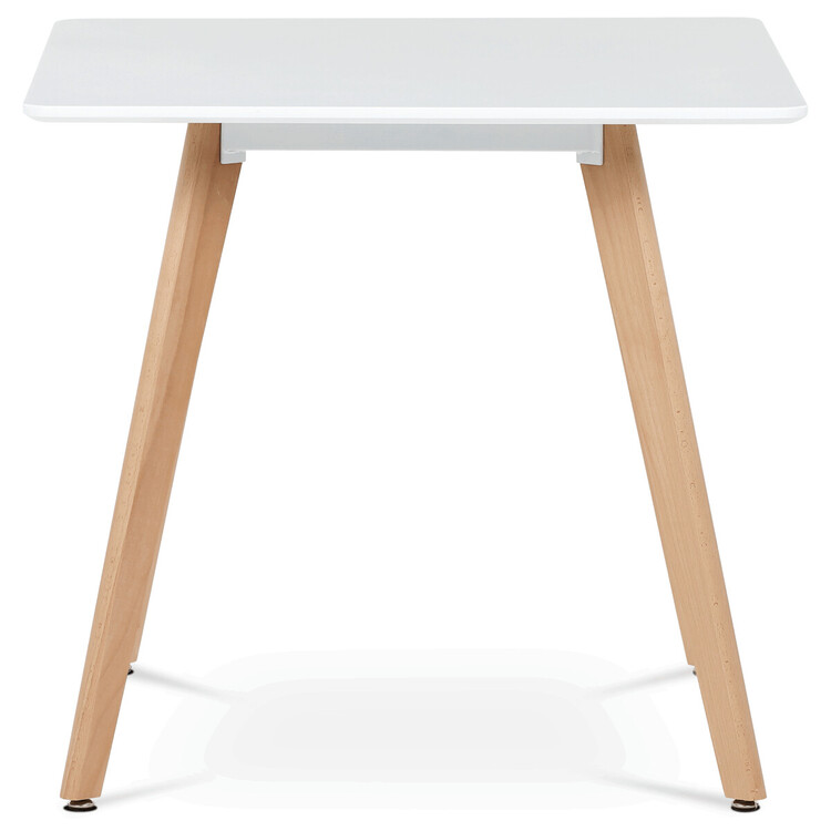 Jídelní stůl o rozměrech 80×80×74 cm kombinuje pevnou desku z MDF s matnou bílou povrchovou úpravou a stabilní nohy z masivního buku. Zaoblené rohy desky přispívají k bezpečnosti a zároveň dodávají moderní vzhled. Stůl je vybaven rektifikačními nohami, které umožňují vyrovnání nerovností podlahy a zajišťují stabilitu během používání. Matný lak na desce usnadňuje údržbu a odolává běžnému opotřebení. Díky kvalitnímu zpracování a použitým materiálům je vhodný pro každodenní použití v jídelnách i kuchyních.