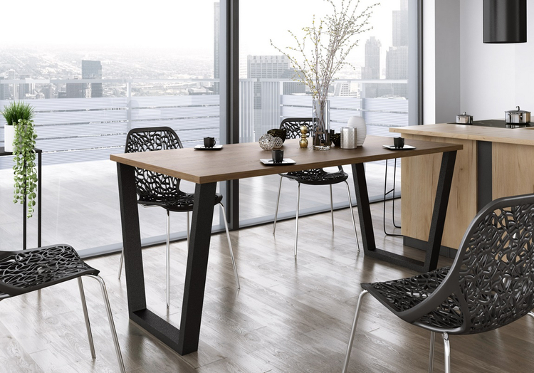 Jídelní stůl je vyroben v jednoduchém industriálním, stylovém a zároveň i moderním designu. Stolová deska je vyrobena z lamina tl.28 mm v barvě dub lancelot, kovové nohy jsou práškově lakované v černé barvě (profil nohy 80×40 mm). Tyto jídelní stoly nabízíme v různých rozměrech a barvách. Dodáváme v demontovaném stavu.CASA 87019