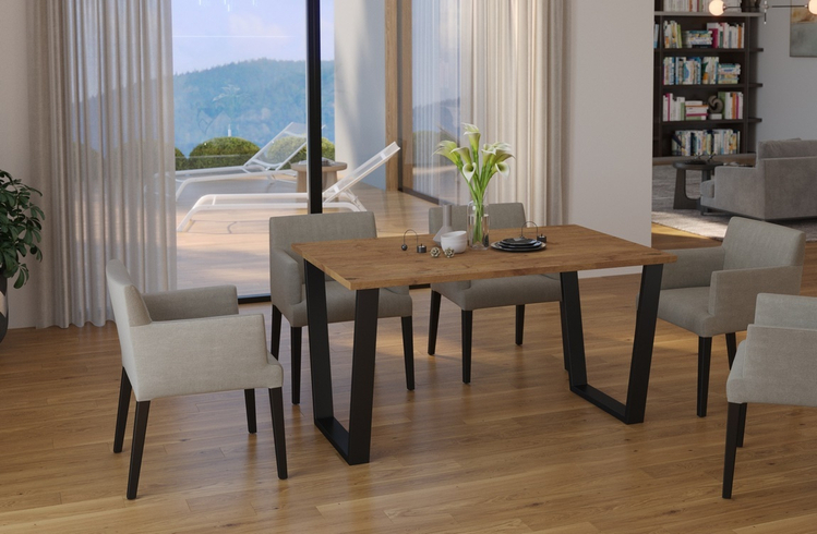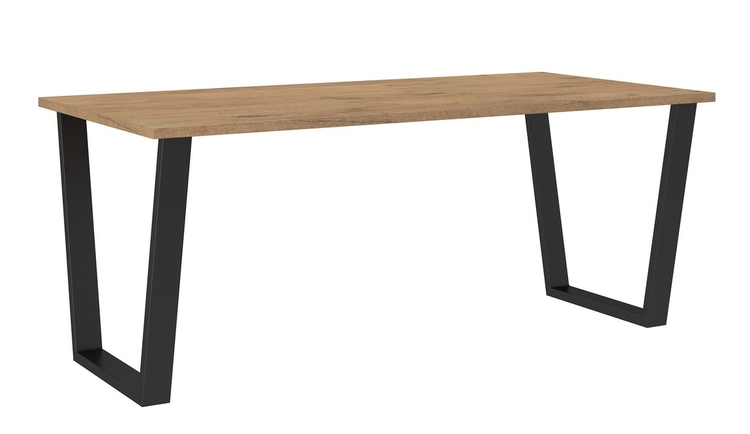 Jídelní stůl je vyroben v jednoduchém industriálním, stylovém a zároveň i moderním designu. Stolová deska je vyrobena z lamina tl.28 mm v barvě dub lancelot, kovové nohy jsou práškově lakované v černé barvě (profil nohy 80×40 mm). Tyto jídelní stoly nabízíme v různých rozměrech a barvách. Dodáváme v demontovaném stavu.CASA 87019