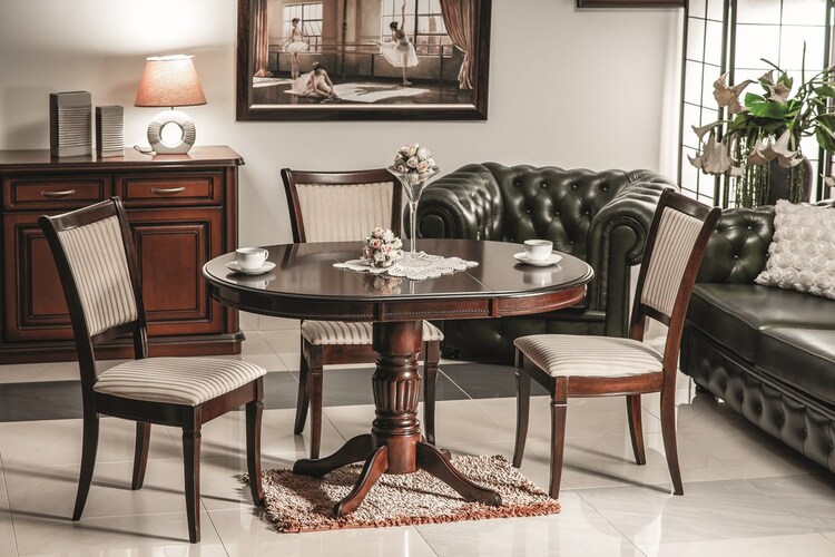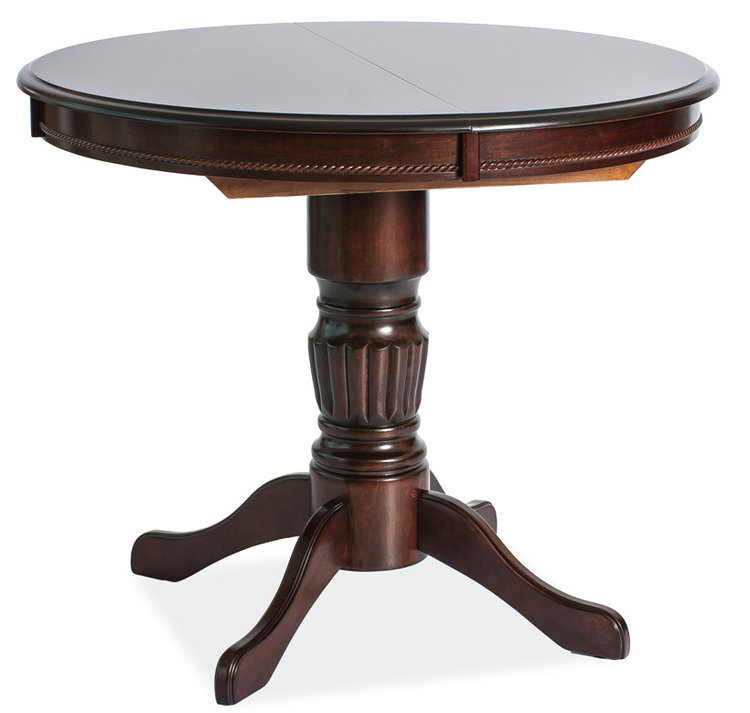 Elegantní jídelní stůl v rustikálním duchu. Zajímavý vzhled stolu vyzdvihují jemné tvary a dokonalými detaily. Tento kulatý stůl je vyrobený z kvalitního přírodního dřeva v barevném provedení – tmavý ořech. Plocha před rozložením je 90 × 90 cm, po rozložení 90 × 125 cm. Výška stolu je 75 cm. Stůl je určený pro 4 osoby. K tomuto stolu doporučujeme židle v naší nabídce.CASA 11489