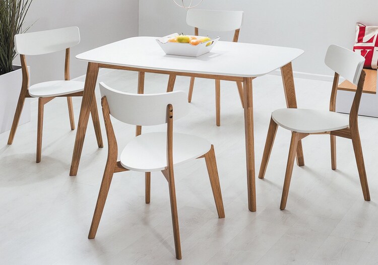 Jídelní stůl ve stylu Scandinavian. Deska stolu je vyrobena z kvalitní MDF v kombinaci s přírodní dýhou v bílé barvě, nohy stolu jsou z masivního dřeva – dub. K tomuto stolu doporučujeme židle v naší nabídce. Dodáváme v demontovaném stavu.CASA 11514