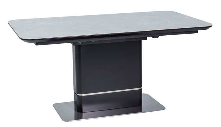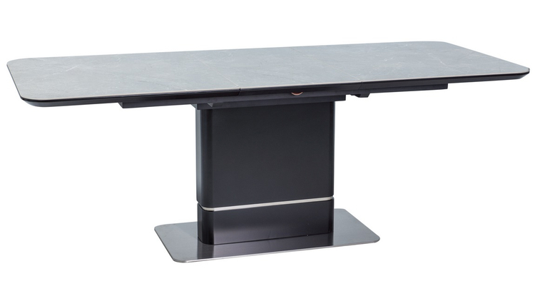 Elegantní rozkládací jídelní stůl v luxusním provedení. Stůl je vyroben z kvalitní MDF lakované matnou černou barvou odolnou proti oděru v kombinaci s italskou keramikou v imitaci šedého mramoru. Podstavec je v kombinaci s leštěnou ocelí. Stůl je určen až pro 8 osob. K tomuto stolu doporučujeme židle z naší nabídky. Plocha stolu před rozložením je 90 × 160 cm, plocha stolu po rozložení je 90 × 210 cm. Dodáváme v demontovaném stavu.CASA 11835