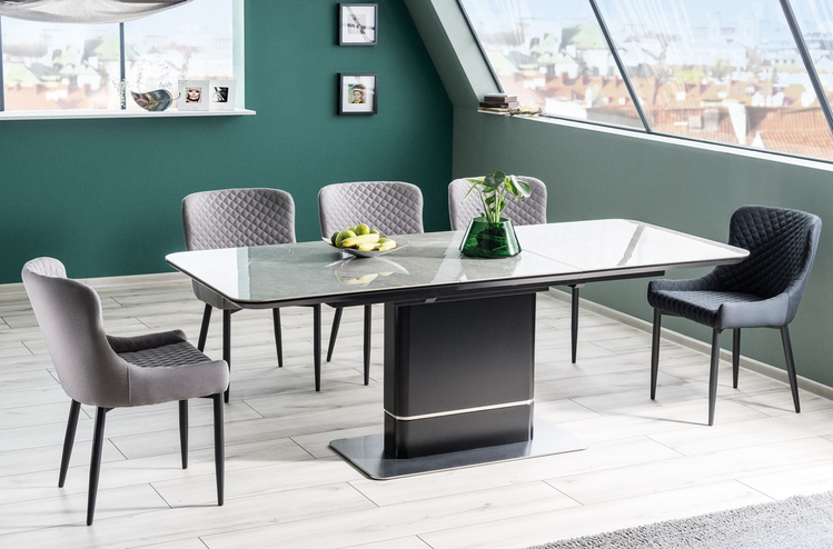 Elegantní rozkládací jídelní stůl v luxusním provedení. Stůl je vyroben z kvalitní MDF lakované matnou černou barvou odolnou proti oděru v kombinaci s italskou keramikou v imitaci šedého mramoru. Podstavec je v kombinaci s leštěnou ocelí. Stůl je určen až pro 8 osob. K tomuto stolu... více informací o zboží
