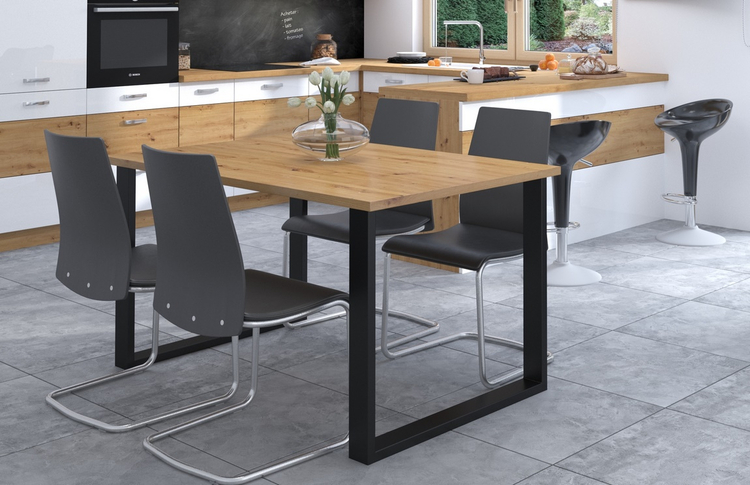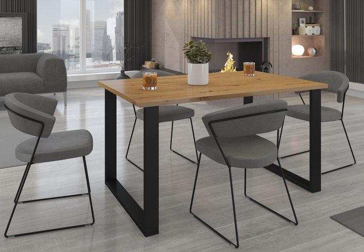 Jídelní stůl je vyroben v jednoduchém industriálním, stylovém a zároveň i moderním designu. Stolová deska je vyrobena z lamina tl. 28 mm v barvě dub artisan, kovové nohy jsou práškově lakované v černé barvě (profil nohy 80×40 mm). Tyto jídelní stoly nabízíme v různých rozměrech. Dodáváme v demontovaném stavu.CASA 87018