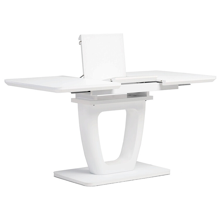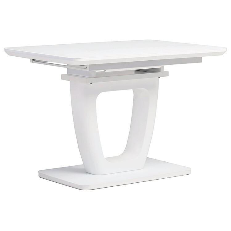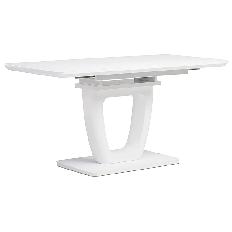 Designový jídelní rozkládací stůl o rozměru 110 + 40 × 75 cm. Vrchní stolová deska je tvrzeného skla tl. 4 mm v bílé barvě. Díl rozkladu je také krytý bílým sklem jako celá stolová deska, což nepatří ke standardům a řadí stůl do vyšší kategorie. Podkladová deska, centrální noha je z MDF je čistě bílá v matném provedení. Podesta je z také z MDF a krytá sklem v barvě. Ze spodní části opatřená plastovými kluzáky, eleminujícími poškození povrchů tvrdých podlah. Mechanické součásti jsou kovové.Stůl jistě zaujme svým nadčasovým designem i skvěloým zpracováním detailu a v neposlední řadě i barvou a stane se elegantním prvkem v moderních i klasicky laděných jídelnách, kuchyních a obývacích prostorách.Výška stolu je 76 cm. Ke stolu je možné umístit až 6 židlí.