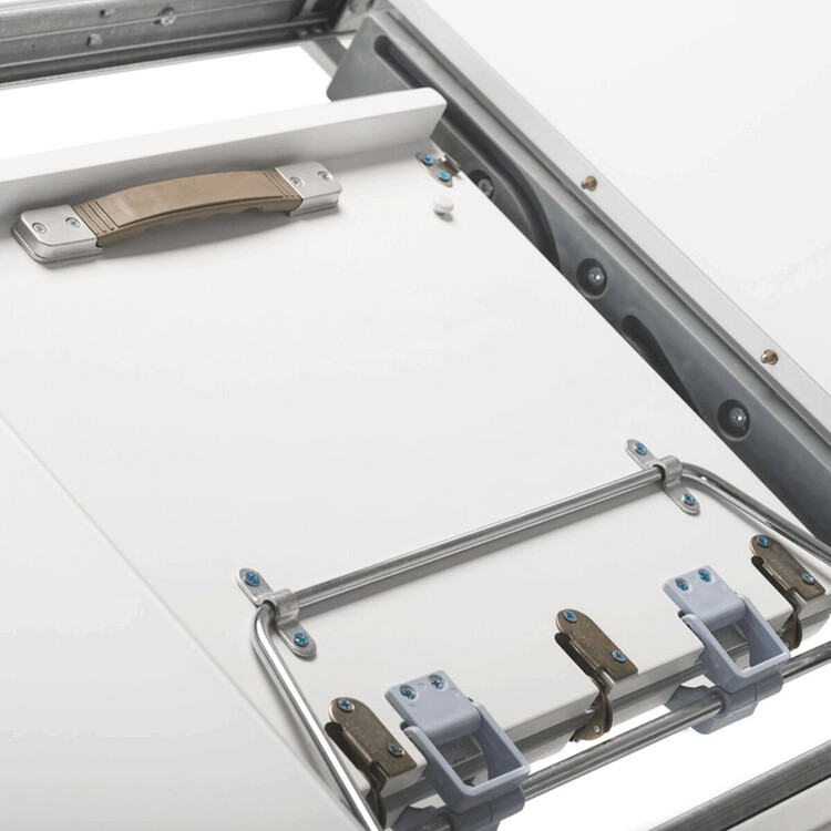 Designový jídelní rozkládací stůl o rozměru 110 + 40 × 75 cm. Vrchní stolová deska je tvrzeného skla tl. 4 mm v bílé barvě. Díl rozkladu je také krytý bílým sklem jako celá stolová deska, což nepatří ke standardům a řadí stůl do vyšší kategorie. Podkladová deska, centrální noha je z MDF je... více informací o zboží