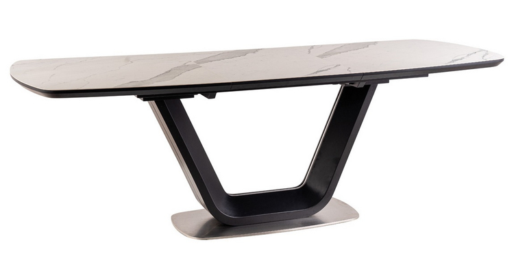 Moderní rozkládací jídelní stůl v elegantním a praktickém provedení bude dominantním prvkem v každé kuchyni, jídelně či kanceláři. Podstavec je vyroben z kvalitní MDF lakované černou barvou odolnou proti oděru v kombinaci s leštěnou ocelí, deska stolu je z MDF a italské keramiky v bílé barvě. Plocha stolu před rozložením je 90 × 160 cm, plocha stolu po rozložení je 90 × 220 cm. Stůl je určen až pro 8 osob. K tomuto stolu doporučujeme židle z naší nabídky. Dodáváme v demontovaném stavu.CASA 11003