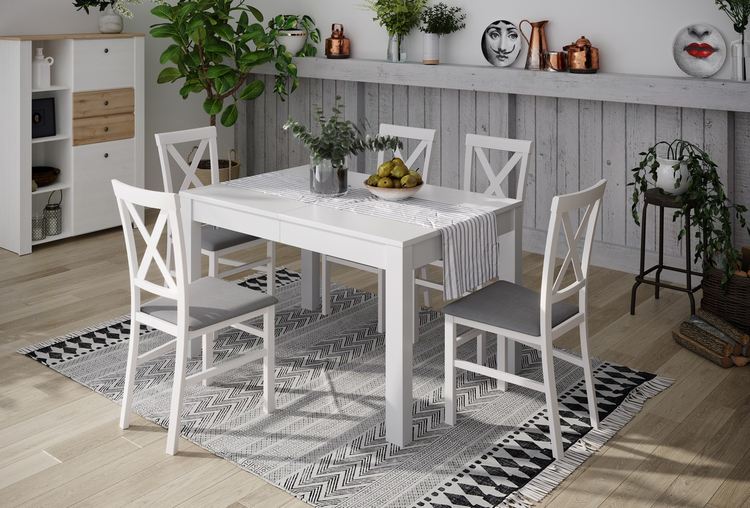 Jídelní stůl rozkládací. Deska jídelního stolu je vyrobena z LTD v barvě bílá mat, nohy stolu jsou z materiálu MDF v barvě bílá mat. Tento stůl je možné prodloužit na šíři více rozměrů 130/180/230/280 cm. V rámu stolu jsou uloženy 3 desky k prodloužení stolu. Dodáváme v demontovaném stavu.CASA 75074
