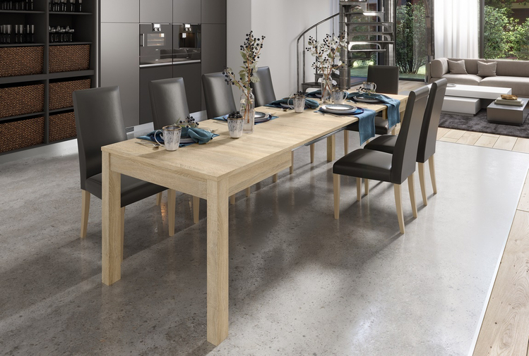 Jídelní stůl rozkládací.Deska jídelního stolu je vyrobena z LTD v barvě dub sonoma, nohy stolu jsou z materiálu MDF v barvě dub sonoma. Tento stůl je možné prodloužit na šíři více rozměrů 130/180/230/280 cm. V rámu stolu jsou uloženy 3 desky k prodloužení stolu. Dodáváme v demontovaném stavu.CASA 75074