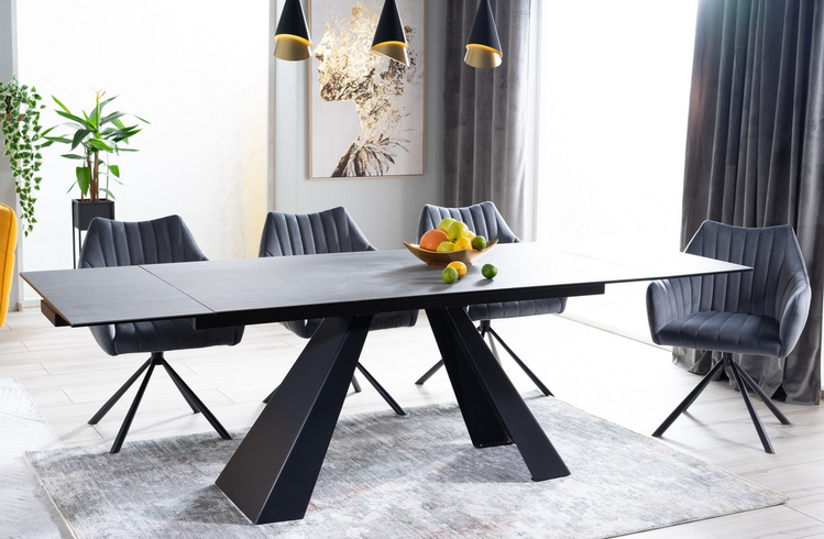 Rozkládací jídelní stůl v moderním provedení. Podstavec je vyroben z kovu v barvě černá mat, deska stolu je z tvrzeného skla a italské keramiky s efektem šedého mramoru. Plocha stolu před rozložením je 90 × 160 cm, plocha stolu po rozložení je 90 × 240 cm. Stůl je určen až pro 8 osob. K tomuto stolu doporučujeme židle z naší nabídky.CASA 11042