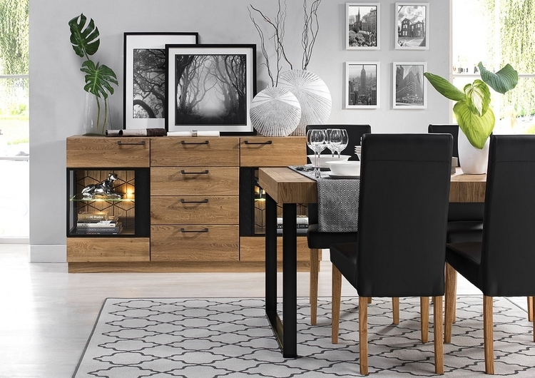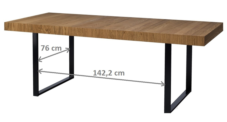 Jídelní stůl rozkládací. Moderní provedení v kombinaci masivního leštěného dubu s kovovými prvky dodá jedinečný vzhled vaší jídelně nebo obývacímu pokoji. Povrch vnějších částí je ošetřen olejem – dub medový nebo lakovaný – černý mat. Stůl je vyroben z masivního dubu, po rozložení se prodlouží jeho šíře na 220 cm. Prostor pro židle u delší strany činí 142 cm, u kratší strany 76 cm. Nohy jsou kovové, černé. Dodáváme v demontovaném stavu.CASA 75022