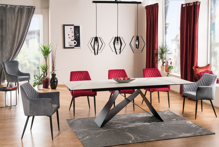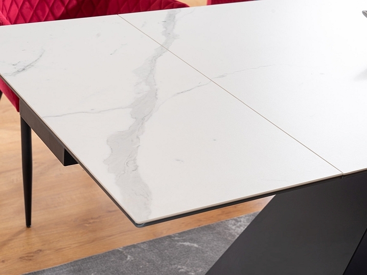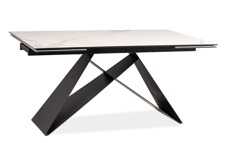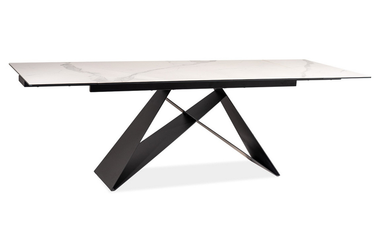 Luxusní rozkládací jídelní stůl ve velmi elegantním provedení bude dominantním prvkem v každé kuchyni, jídelně či kanceláři. Podstavec je vyroben z kovu v černé matné barvě, deska stolu je vyrobena z tvrzeného skla a italské keramiky s efektem bílého mramoru. Plocha stolu před rozložením je 90 × 160 cm, plocha stolu po rozložení je 90 × 240 cm. Stůl je určen až pro 8 osob. K tomuto stolu doporučujeme židle z naší nabídky. Dodáváme v demontovaném stavu.CASA 11763