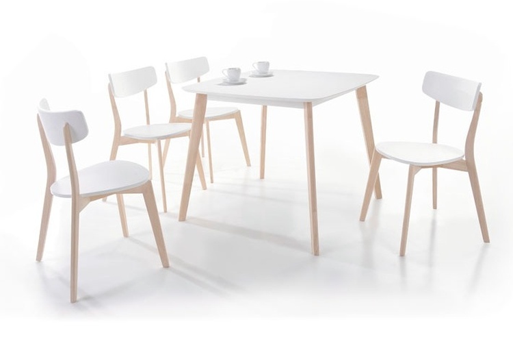 Moderní jídelní stůl v elegantním stylu. Je vyroben ze dřeva v barvě bělený dub, deska stolu je z MDF bílé barvy. Stůl je určený pro 4 osoby. K tomuto stolu doporučujeme židle, které naleznete v nabídce.CASA 11725