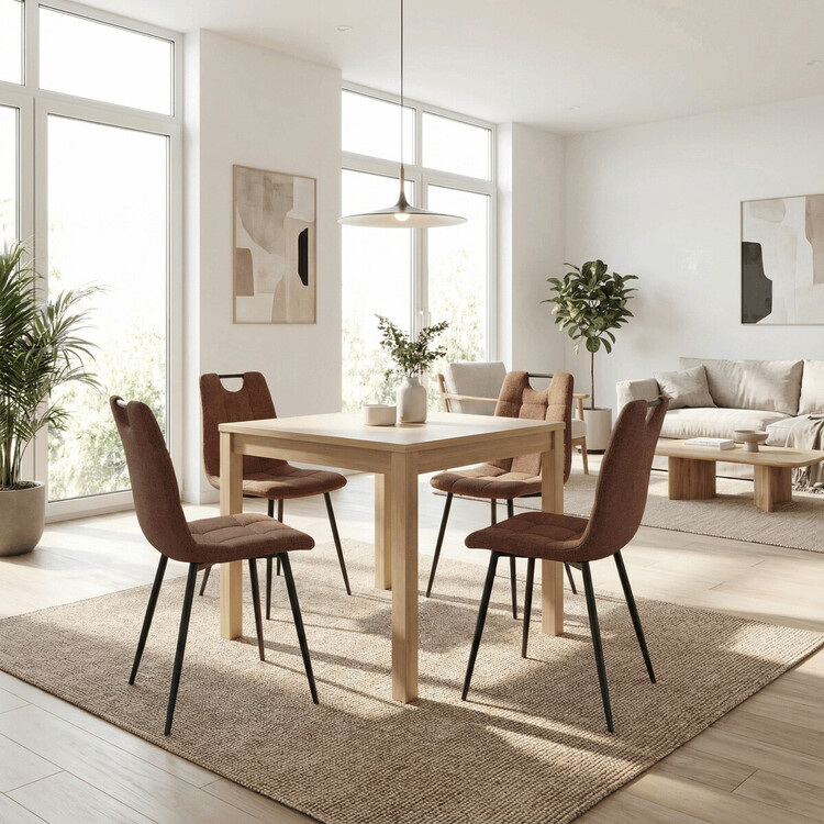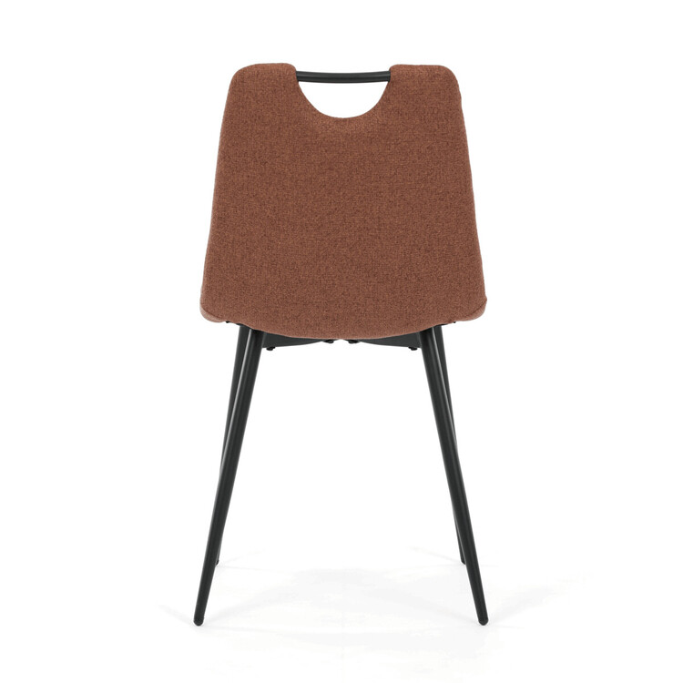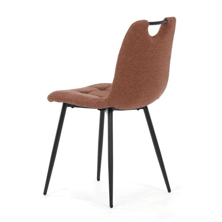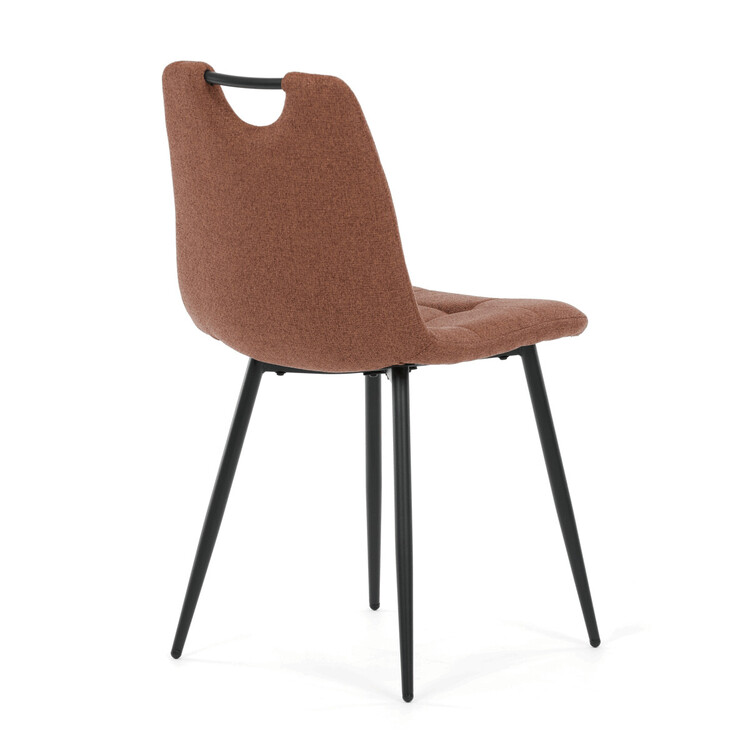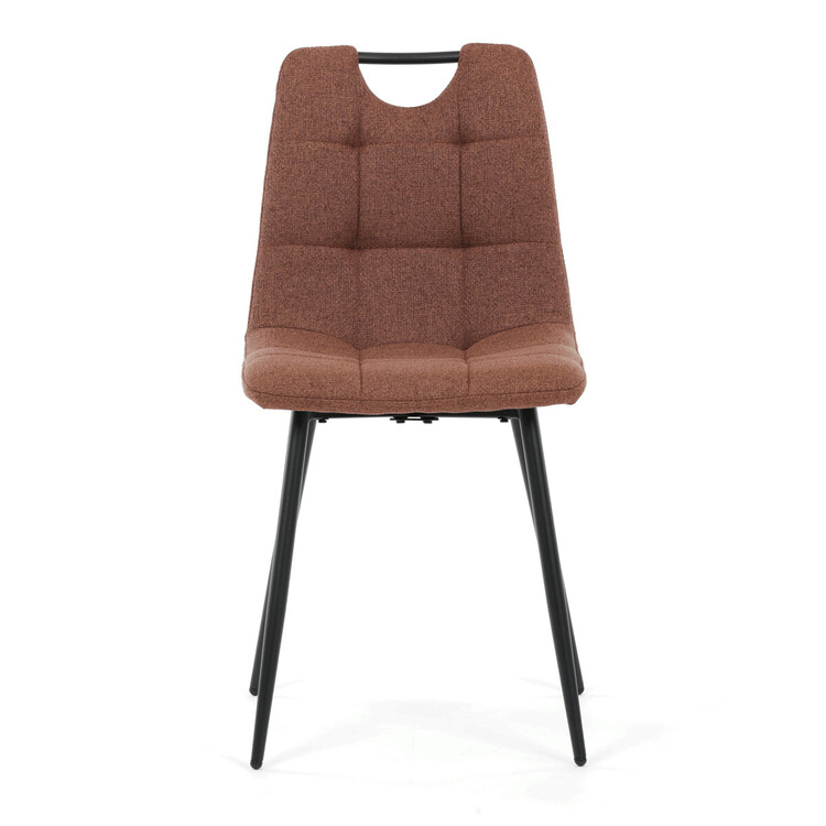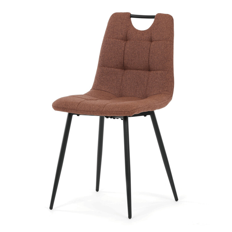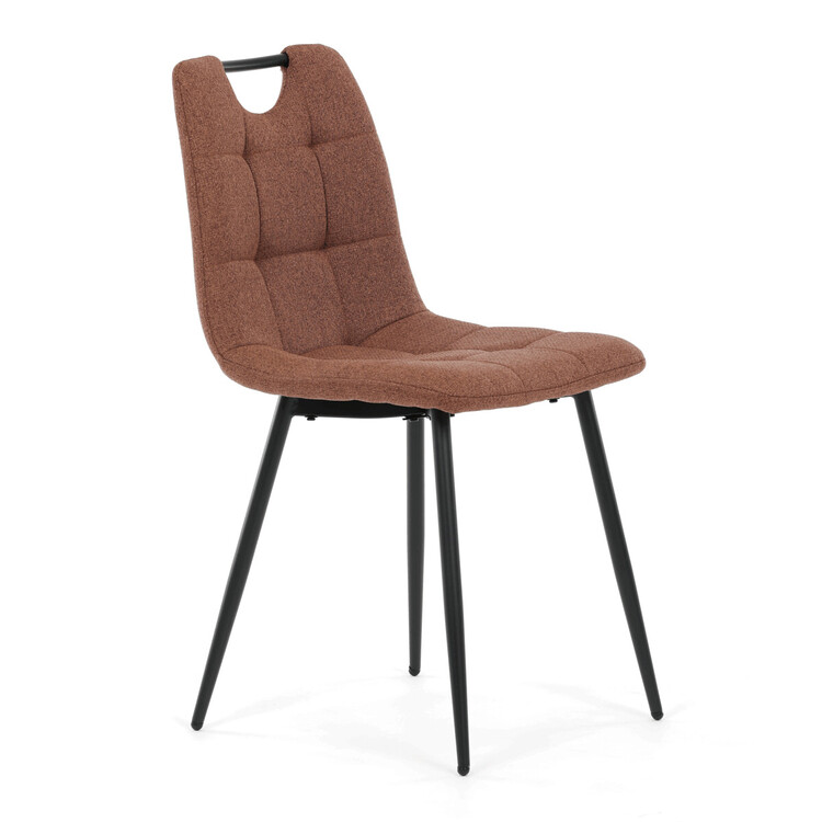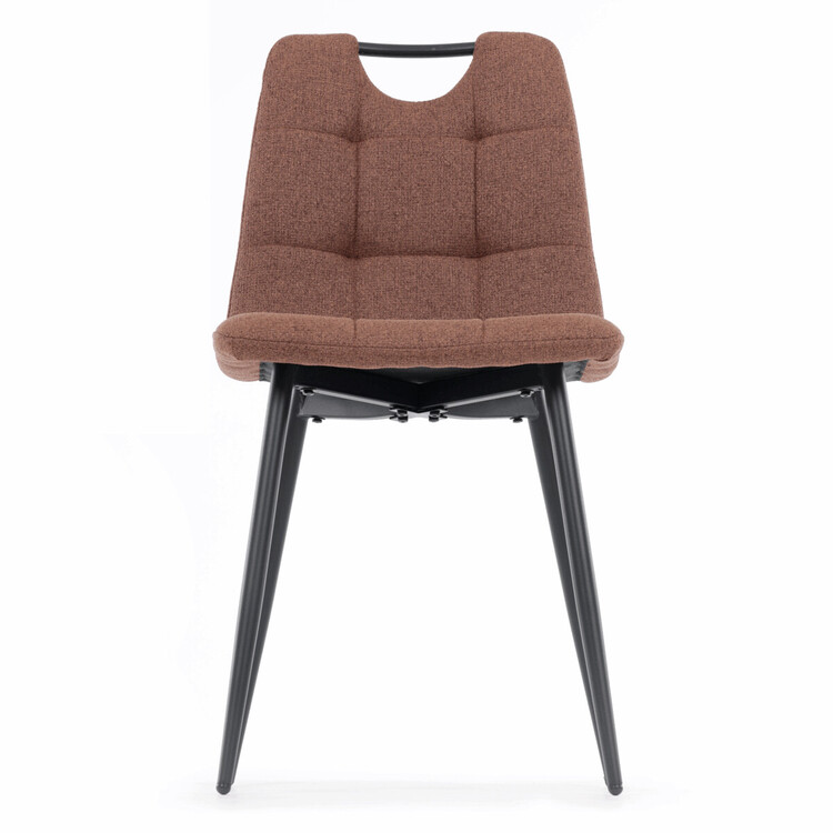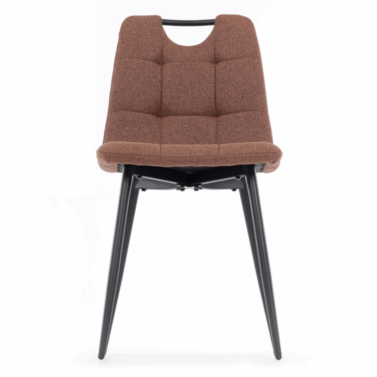 Jídelní židle DCL-V2017 BR2 kombinuje pohodlí s praktickým designem vhodným do moderních interiérů. Sedák a opěradlo jsou potaženy hnědou látkou, která je snadno udržovatelná a doplněná designovým prošitím pro zvýraznění estetického dojmu. Černé matné kovové nohy zajišťují stabilitu a pevnost celé židle, zatímco madlo v horní části opěradla usnadňuje manipulaci a přenášení. Absence područek umožňuje větší variabilitu uspořádání u jídelního stolu. Židle je navržena tak, aby poskytovala komfortní posezení s důrazem na jednoduchou údržbu a dlouhou životnost.