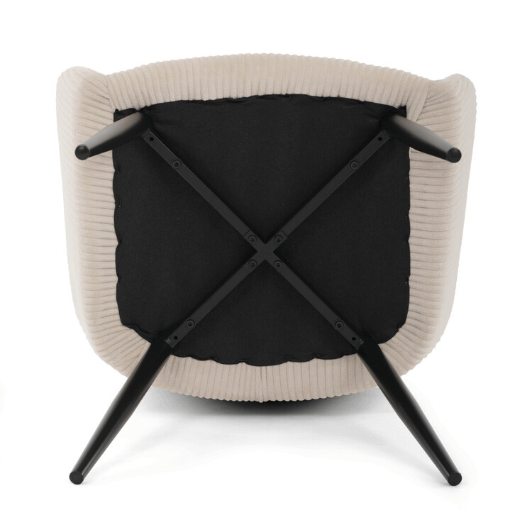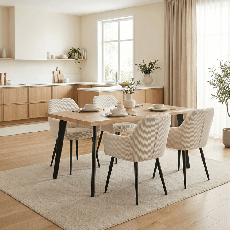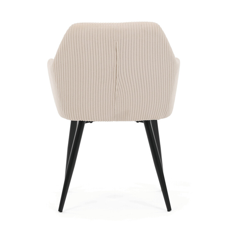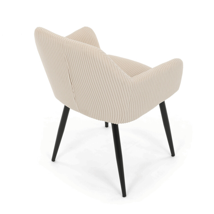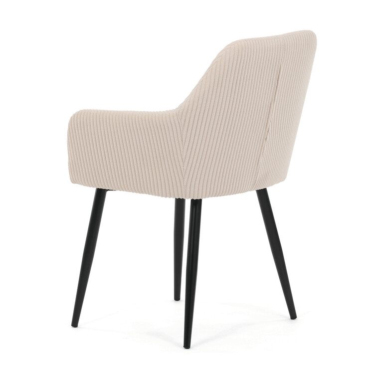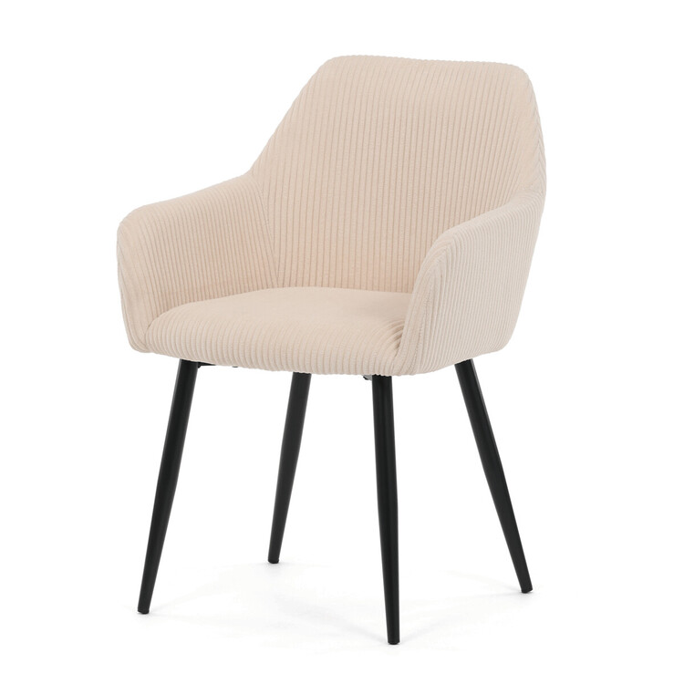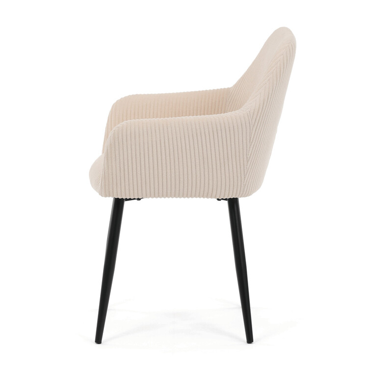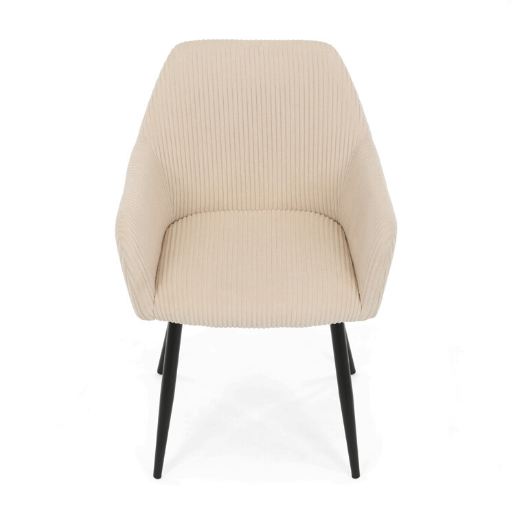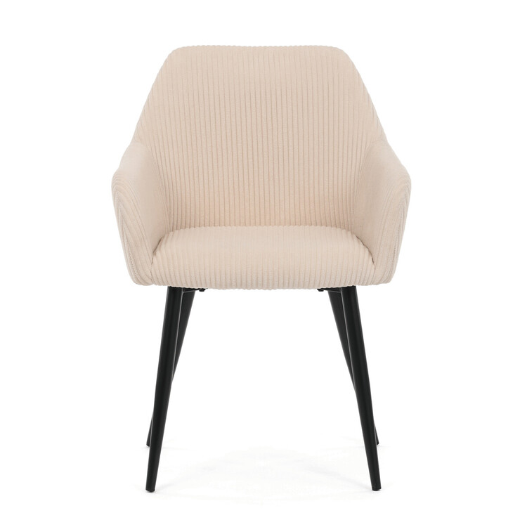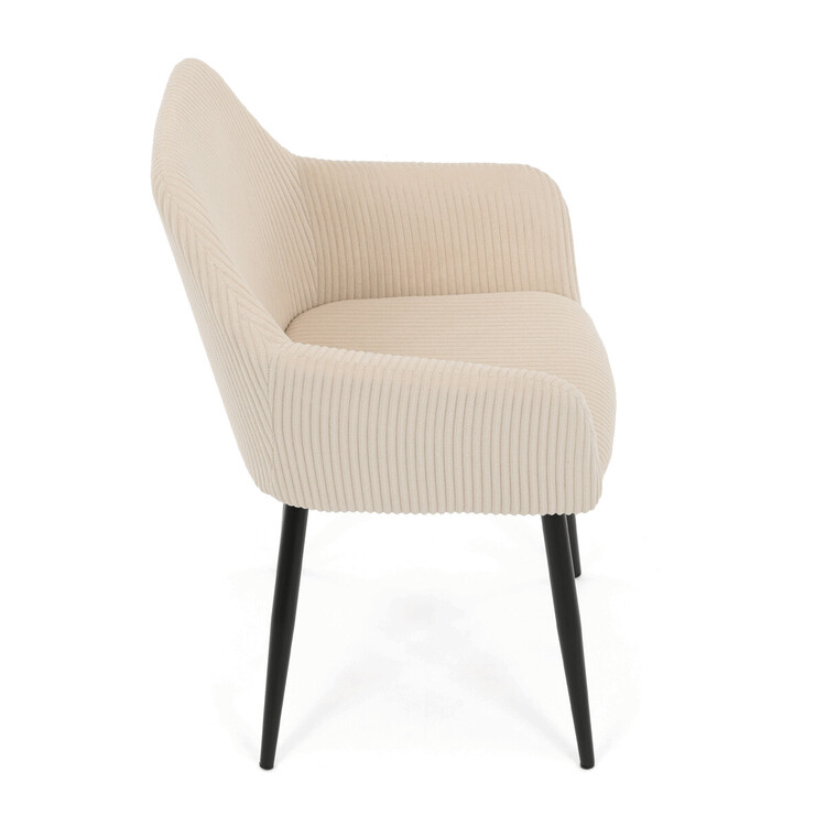 Čalouněná židle s područkami v krémovém manšestru nabízí pohodlné sezení s příjemnou texturou látky, která je příjemná na dotek a snadno se udržuje. Pevné kovové nohy v černém matném provedení zajišťují stabilitu a dlouhou životnost. Ergonomicky tvarované opěradlo a integrované područky podporují správnou polohu těla a přispívají k vyššímu komfortu při delším sezení. Židle je určena pro použití v jídelnách, kancelářích nebo čekárnách, kde oceníte kombinaci designu a funkčnosti. Nosnost a přesné rozměry jsou přizpůsobeny běžným požadavkům na jídelní sezení.