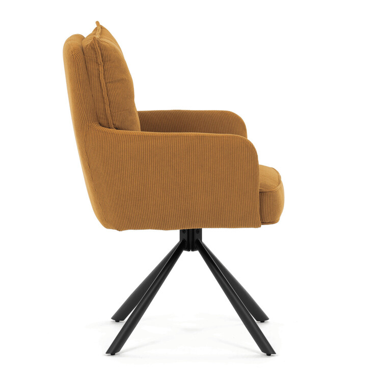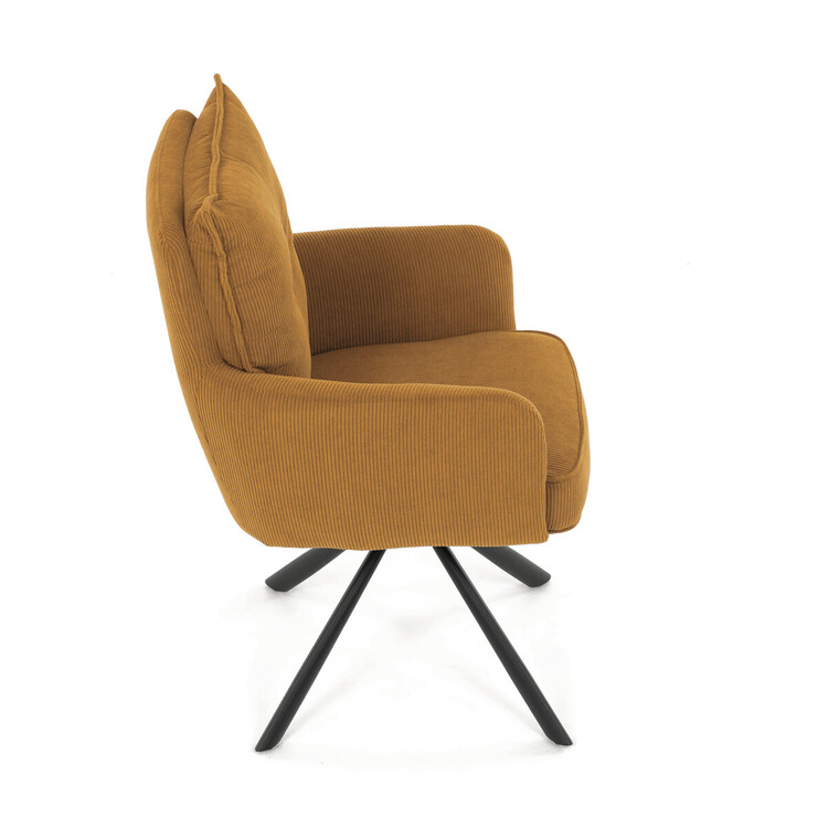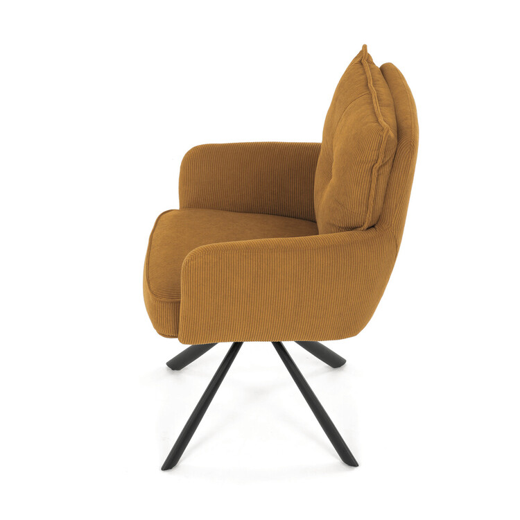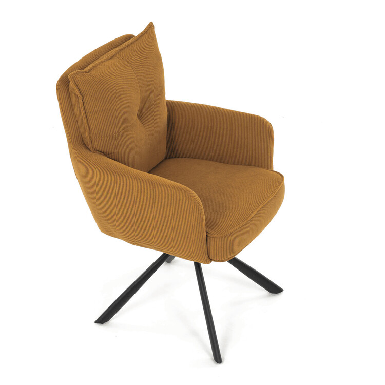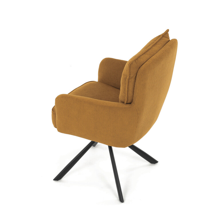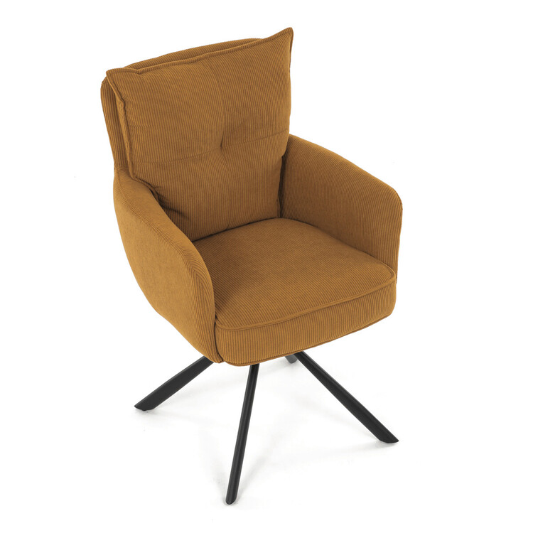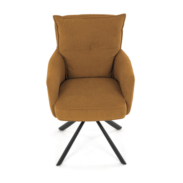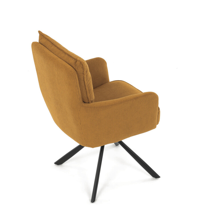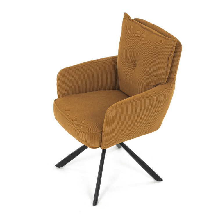 Jídelní židle s označením HC-X1128 YEL2 nabízí komfortní sezení díky vysokému polstrování sedáku a opěradla potažených žlutou manšestrovou látkou, která je příjemná na dotek a snadno se udržuje. Sedák je vybaven taštičkovými pružinami, které zvyšují pohodlí a přispívají k dlouhodobé elasticitě. Židle disponuje otočnou funkcí s možností otáčení o 180° a vratným mechanismem reset, který automaticky vrací židli do výchozí polohy, což usnadňuje manipulaci a zvyšuje ergonomii. Pevné černé kovové nohy zajišťují stabilitu a odolnost, přičemž jejich design dodává židli moderní vzhled vhodný do různých interiérů. Područky jsou integrované v čalounění, což podporuje pohodlné opření rukou během sezení.