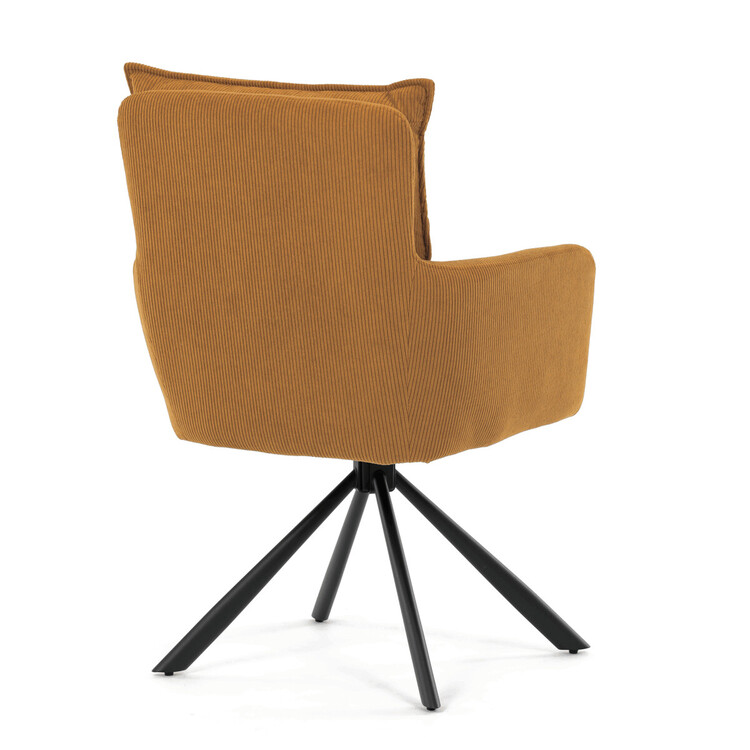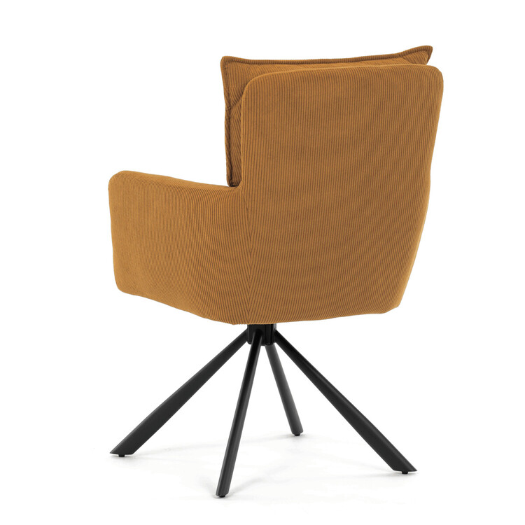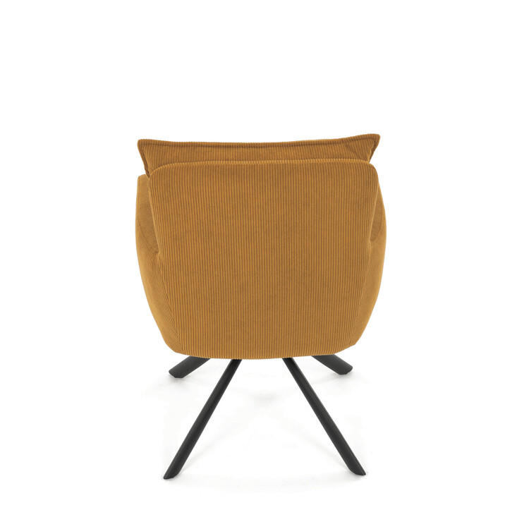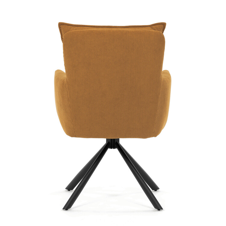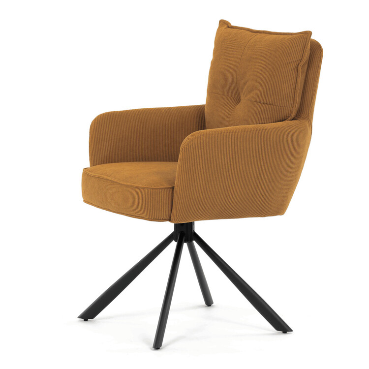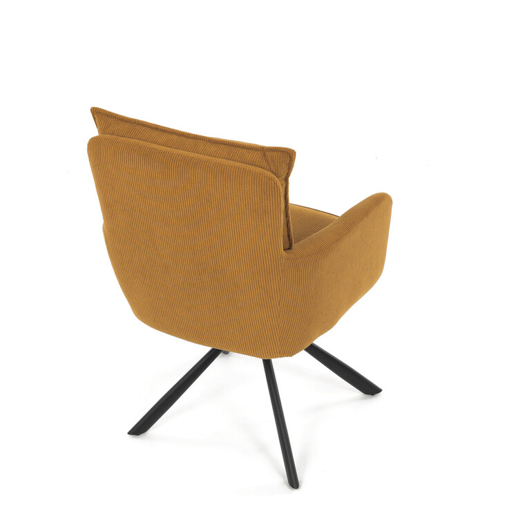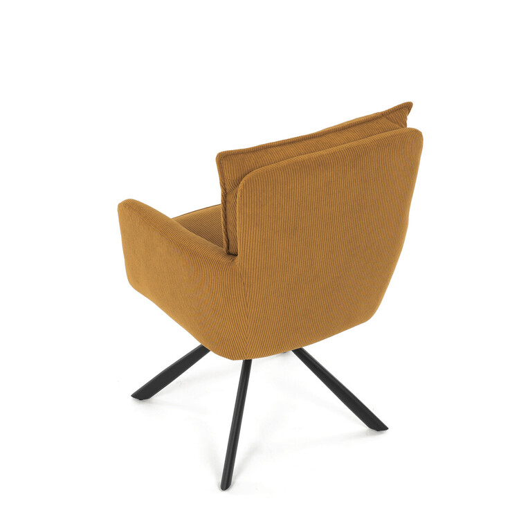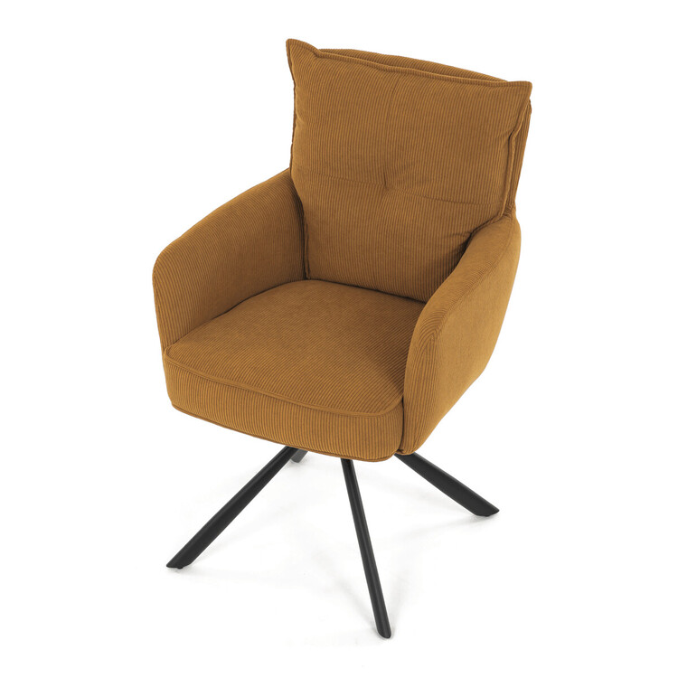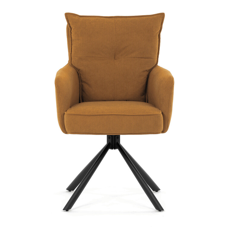 Jídelní židle s označením HC-X1128 YEL2 nabízí komfortní sezení díky vysokému polstrování sedáku a opěradla potažených žlutou manšestrovou látkou, která je příjemná na dotek a snadno se udržuje. Sedák je vybaven taštičkovými pružinami, které zvyšují pohodlí a přispívají k dlouhodobé elasticitě. Židle disponuje otočnou funkcí s možností otáčení o 180° a vratným mechanismem reset, který automaticky vrací židli do výchozí polohy, což usnadňuje manipulaci a zvyšuje ergonomii. Pevné černé kovové nohy zajišťují stabilitu a odolnost, přičemž jejich design dodává židli moderní vzhled vhodný do různých interiérů. Područky jsou integrované v čalounění, což podporuje pohodlné opření rukou během sezení.