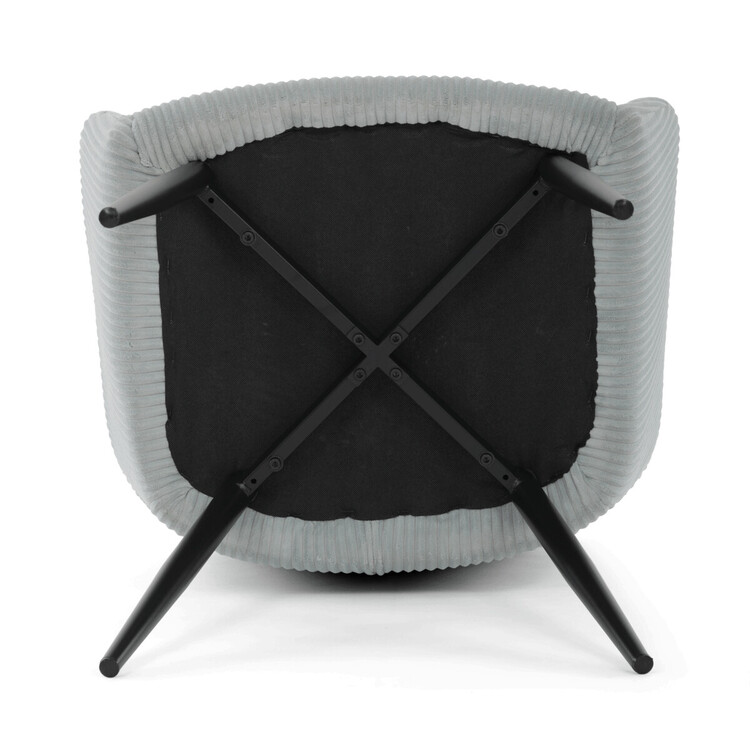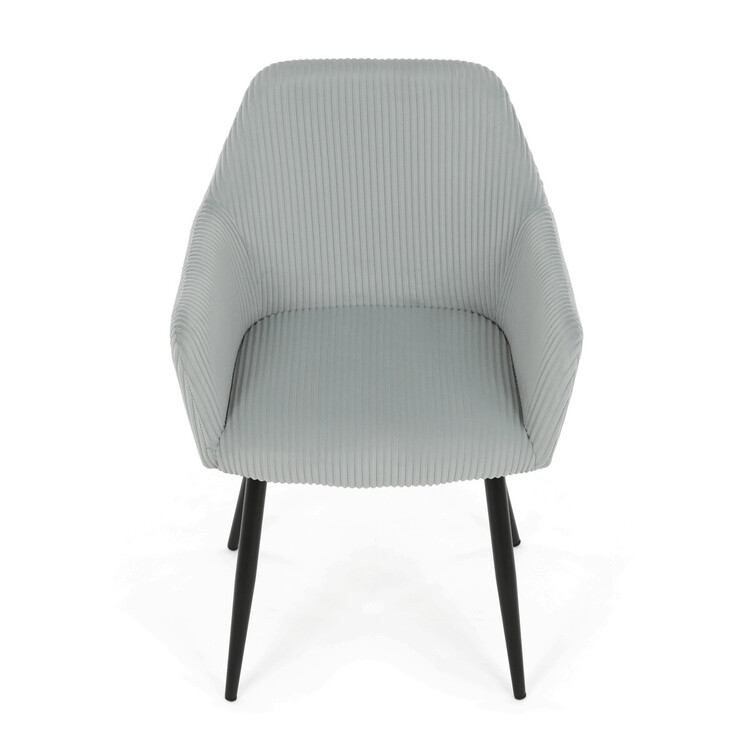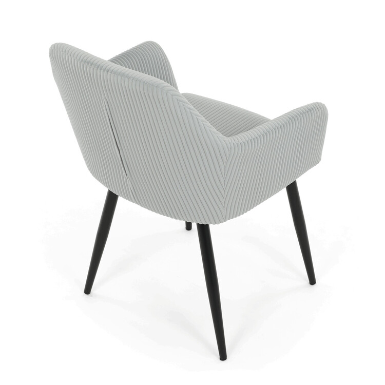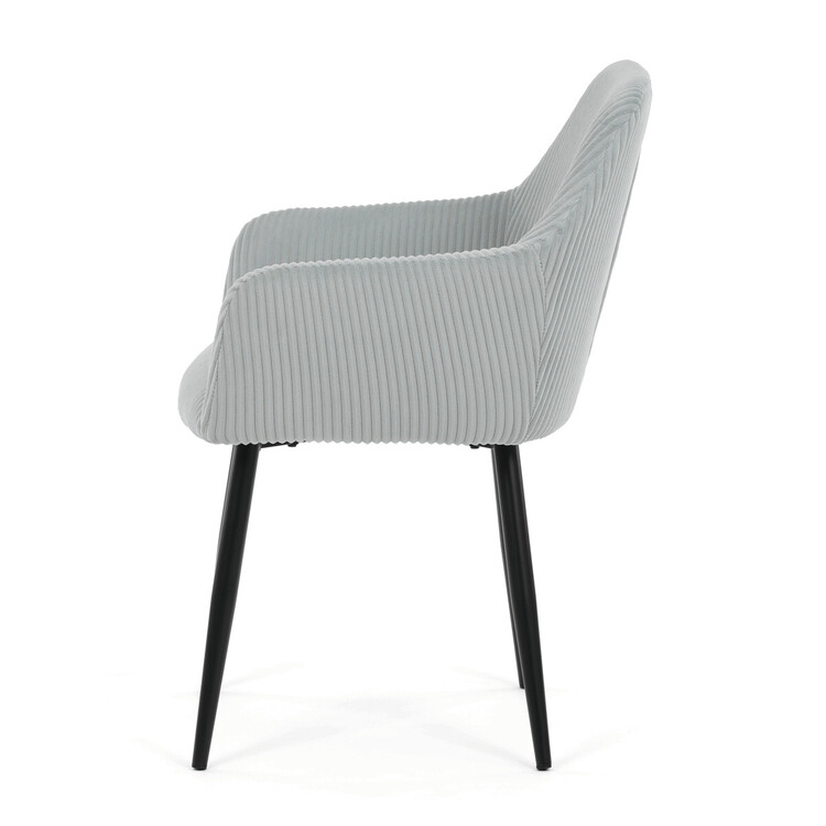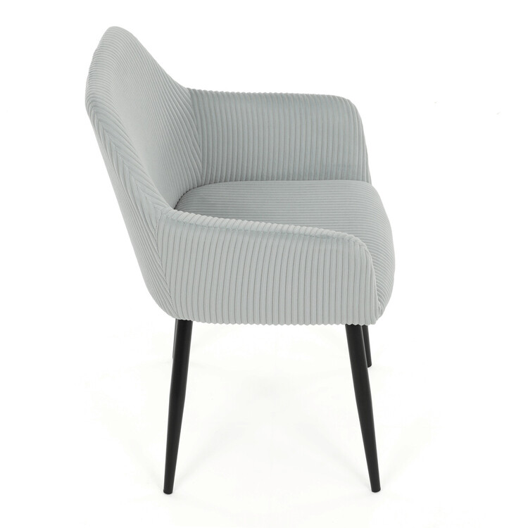 Čalouněná jídelní židle s područkami v světle modrém manšestru nabízí pohodlné sezení s příjemnou texturou látky, která je příjemná na dotek a snadno se udržuje. Sedák i opěradlo jsou vyplněny měkkou pěnou pro zvýšení komfortu během delšího sezení. Stabilní kovové nohy v černém matném provedení zajišťují pevnou oporu a dlouhou životnost. Područky jsou ergonomicky tvarované a doplňují celkový komfort židle. Design spojuje moderní vzhled s praktickými vlastnostmi vhodnými do jídelních i pracovních prostor.