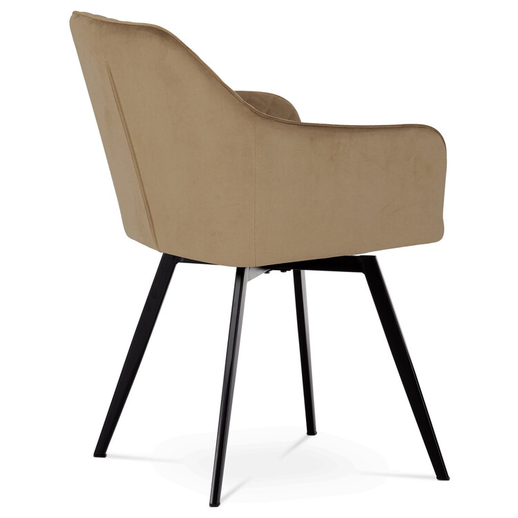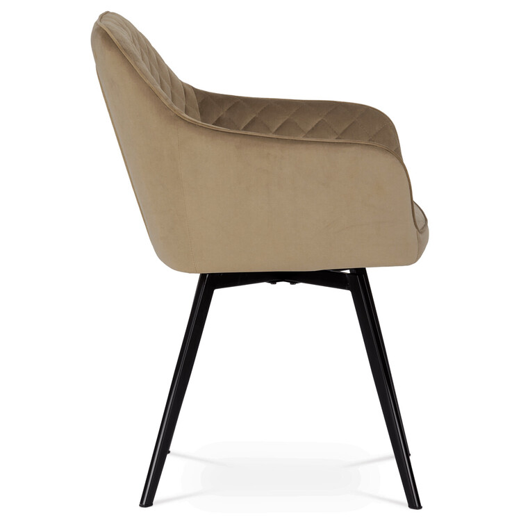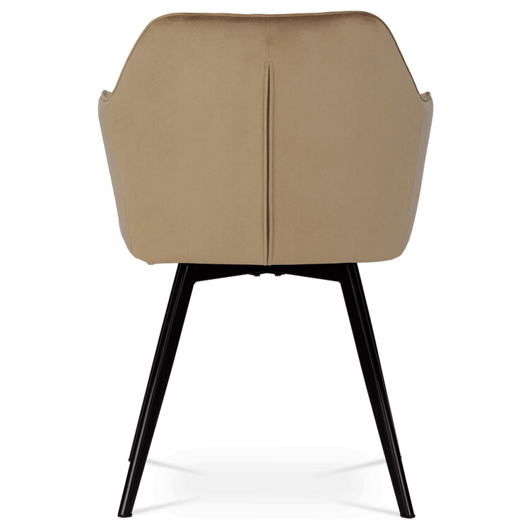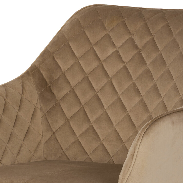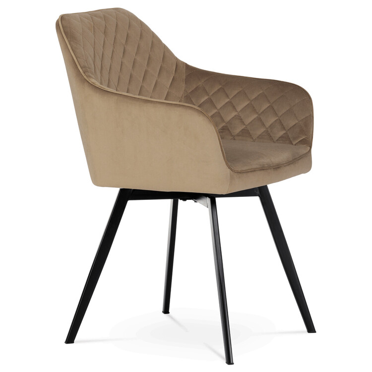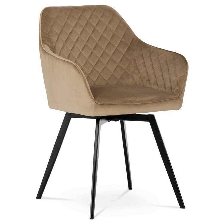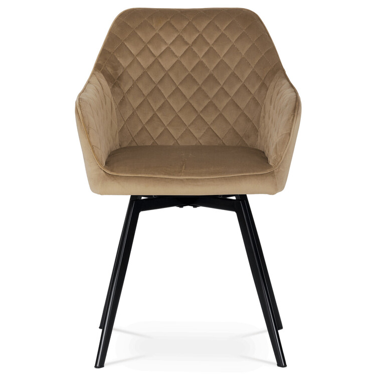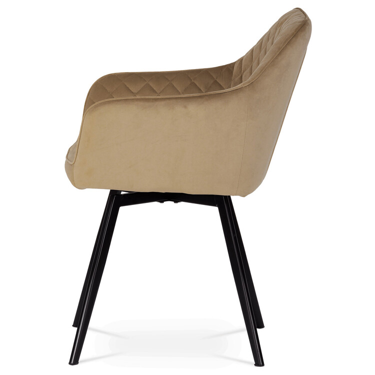 Díky svému dokonalému designu je tato židle v industriálním stylu nezaměnitelná a zároveň velmi pohodlná. Skořepina sedáku a opěradla má potah z kvalitní sametové látky v trendy odstínu zlaté cappuccino v matné úpravě. Polstrování je z PU pěny. Velmi dekorativním prvkem je výrazné kosočtvercové prošití vnitřních ploch v barvě potahu a paspule po obvodu celé skořepiny. Vybraná látka se také velmi dobře čistí. Stabilitu židle zajišťují čtyři kónické kovové nohy obdélníkového průřezu s kvalitním práškovým nástřikem v černé matné barvě. Ukončené jsou černými plastovými kluzáky, zabraňující poškození tvrdých povrchů podlah. Tato provedení produkují z tohoto modelu židle skvělou volbu pro zařízení obývacích či jídelních, ale také zasedacích místností. Nosnost židle je 110 kg.Bonusem této židle je otočný a vratným mechanismus, který umožňuje otáčení o 90° doleva a o 90° doprava a zároveň vždy vrátí sedák do původní polohy. Díky němu žiidle zůstanou vždy srovnané u stolu.