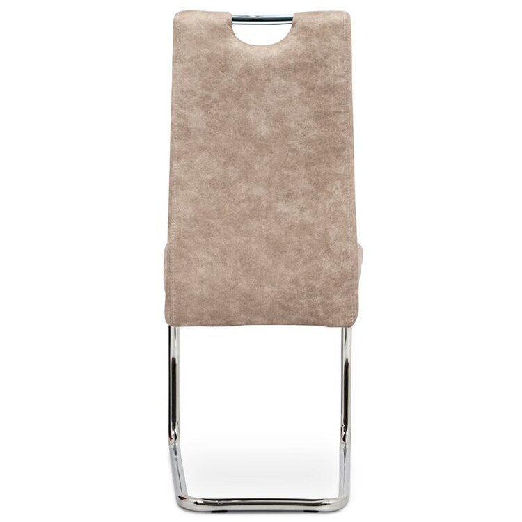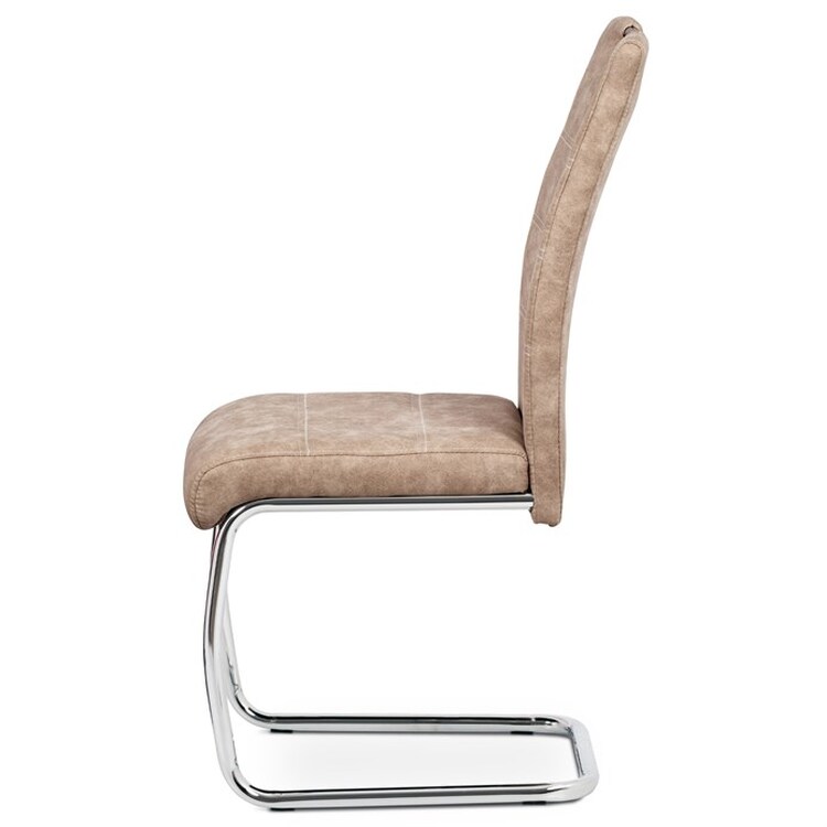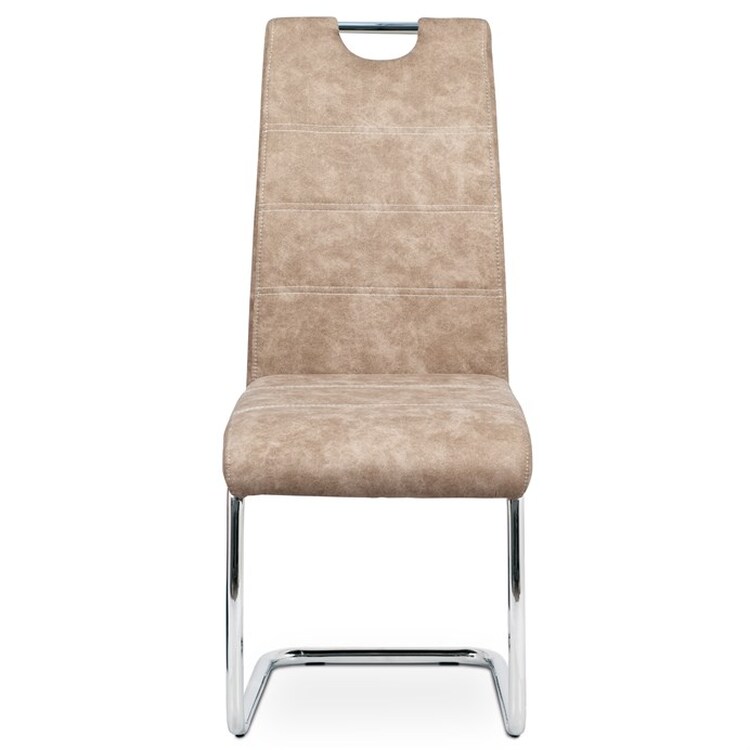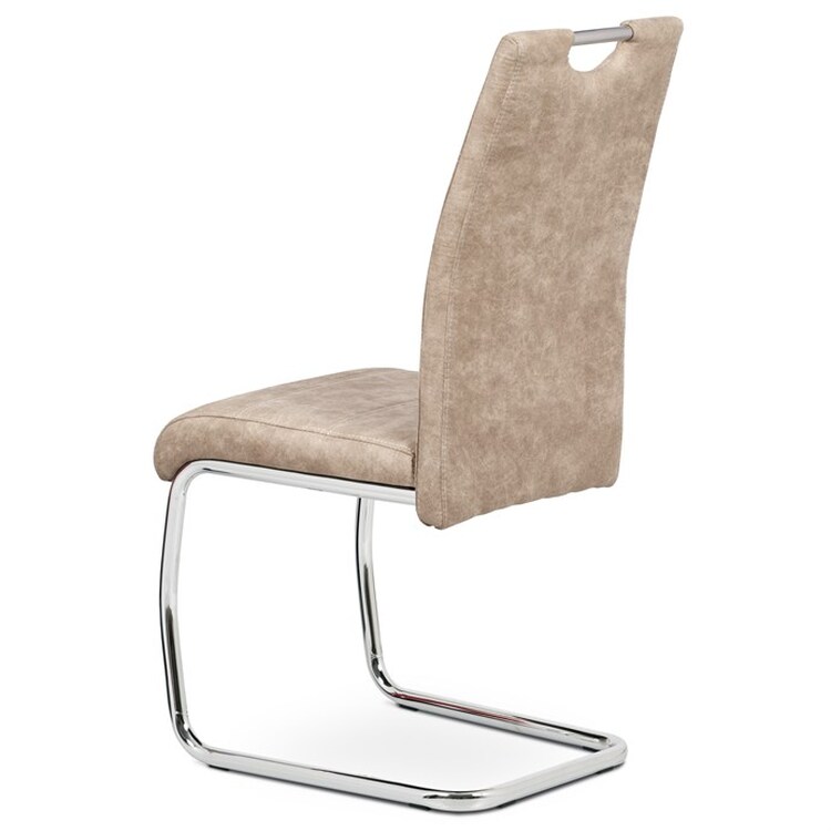 Jídelní židle HC-483 CRM3 v béžovém odstínu s potahem z látky v dekoru vintage kůže kombinuje stylový vzhled s praktickými vlastnostmi. Čalounění z kvalitní látky připomínající kůži je příjemné na dotek a snadno se udržuje, zatímco pevná kovová chromovaná podnož zajišťuje stabilitu a odolnost. Židle je vybavena pohupovým mechanismem, který přispívá k pohodlí při sezení, a ergonomicky tvarovaným opěradlem s praktickým úchytem pro snadnou manipulaci. Absence područek umožňuje větší variabilitu použití a snadné zasunutí pod stůl. Celková výška a rozměry židle jsou navrženy tak, aby poskytovaly komfortní posezení během jídel i delších setkání.