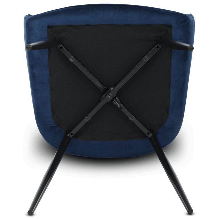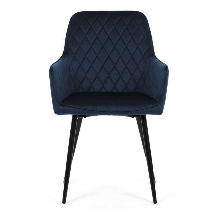 Jídelní židle DCH-215 BLUE4 s potahem z modré sametové látky nabízí příjemný dotek a vizuálně atraktivní design díky prošívání ve tvaru kosočtverců na opěradle a područkách. Pevné kovové nohy v černém matném provedení zajišťují stabilitu a dlouhou životnost. Sedák i opěradlo jsou vyplněné měkkou pěnou, která přispívá k pohodlnému posezení během delších jídel i setkání. Područky jsou integrované do tvaru židle, což podporuje ergonomii a komfort uživatele. Židle je vhodná do moderních interiérů, kde vynikne její elegantní sametový vzhled a kvalitní zpracování.