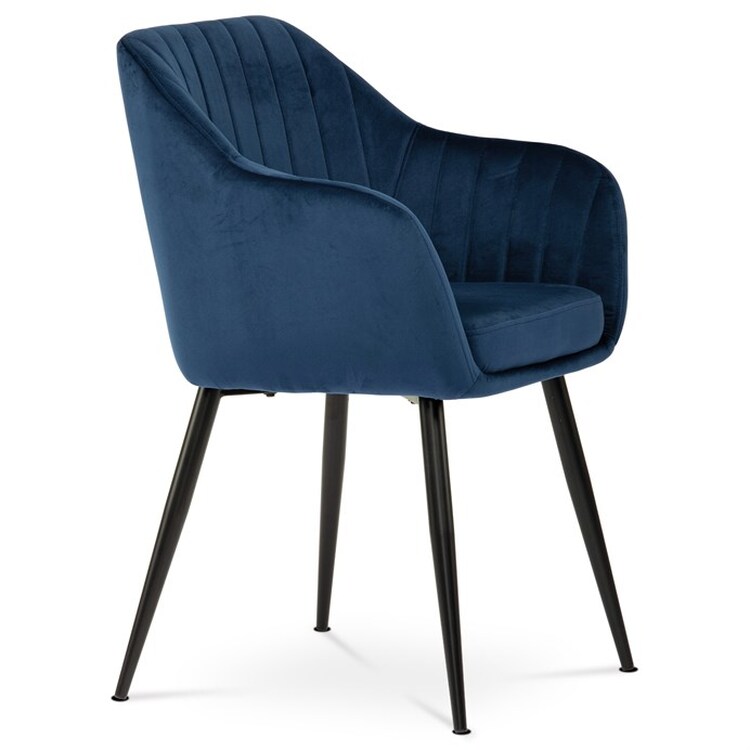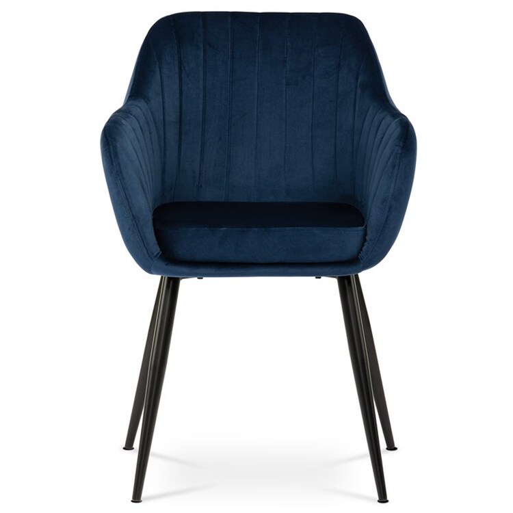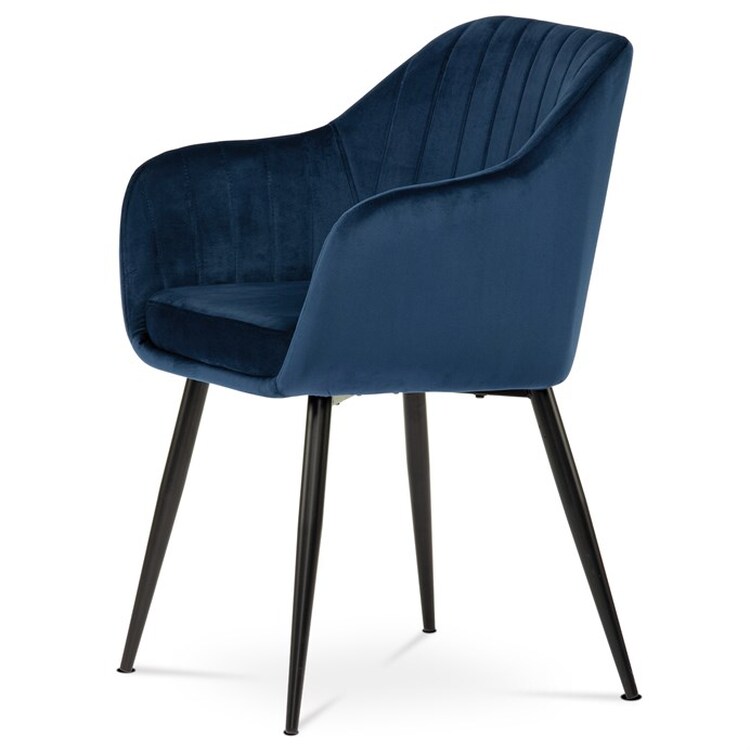 Dokonalý design, industriální styl a perfektní pohodlí je pro tuto židli samozřejmostí. Skořepina sedáku i opěradla má pevnou kovovou kostru, potah z velmi kvalitní sametové látky v matném provedení a luxusním odstínu NAVY modré. Polstrování je z PU pěny. Bonusem ke zvýšení pohodlí posedu je 8 cm zvýšený a extra polstrovaný sedák a praktické pohodlné opěrky s opěrnou plochou ve výšce 69 cm od podlahy. Příjemný dekorativní prvek vytvářejí svislá prošití vnitřních částí opěradla i boků. Použitá látka je velmi odolná a perfektně se čistí.Stabilitu židle zajišťují čtyři kónické kovové nohy s kvalitním práškovým nástřikem v černé matné barvě. Ukončené jsou černými plastovými kluzáky, zabraňující poškození tvrdých povrchů podlah. Nohy mají kruhový průřez o průměru od 2 do 3,5 cm v horní části.Všechna tato plus produkují z tohoto modelu skvělou volbu pro Váš výběr zařízení jídelních a nebo obývacích prostor, ale skvěle se hodí i jako konferenční židle do zasedacích místností.Nosnost židle je až 120 kg. Základní rozměry jsou – celková šíře 58 cm, celková hloubka 57 cm, celková výška 84 cm, výška sedu 52 cm a hloubka sedu 43 cm.