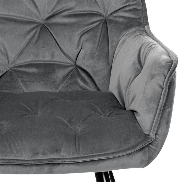 Jídelní židle s označením DCH-421 GREY4 nabízí pohodlné sezení díky čalounění z šedé sametové látky, která je příjemná na dotek a snadno se udržuje. Sedák i opěradlo jsou doplněny designovým prošitím, které podtrhuje moderní vzhled židle. Pevná čtyřnohá podnož z kovu s černým lakem zajišťuje stabilitu a dlouhou životnost. Židle je vybavena integrovanými područkami, které přispívají k většímu komfortu při sezení. Díky svým rozměrům a konstrukci je vhodná pro použití v jídelnách i dalších obytných prostorách.