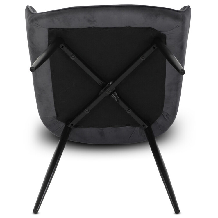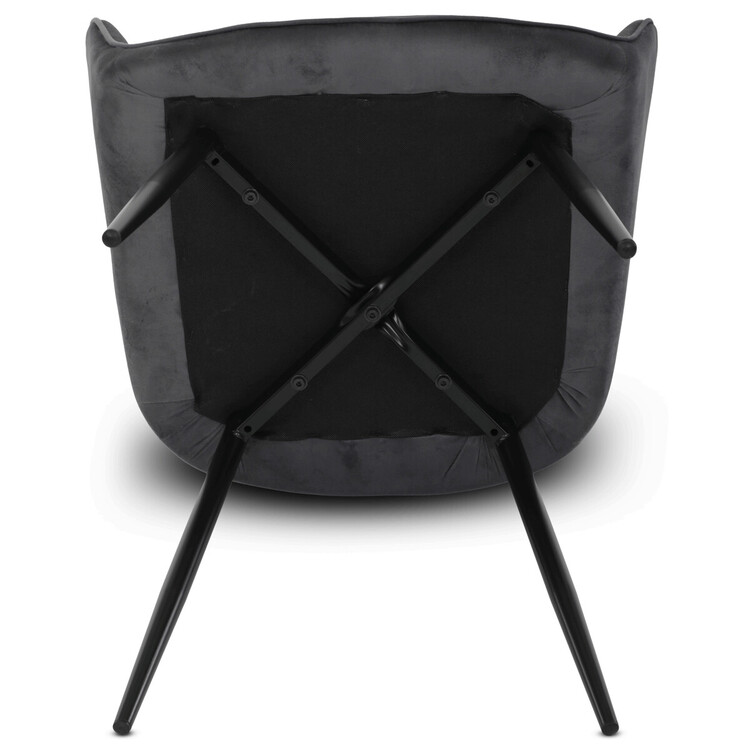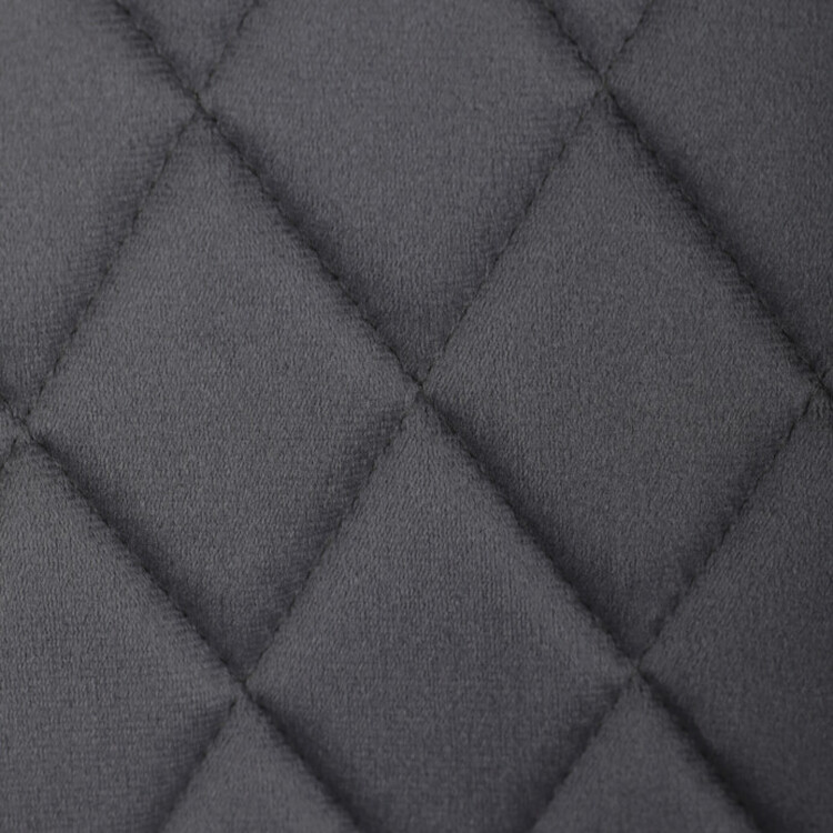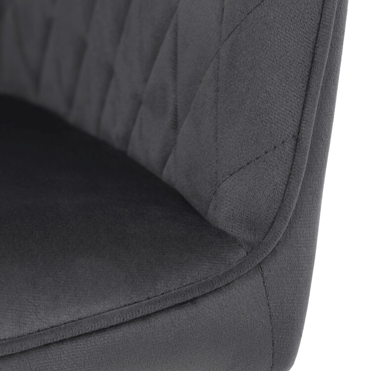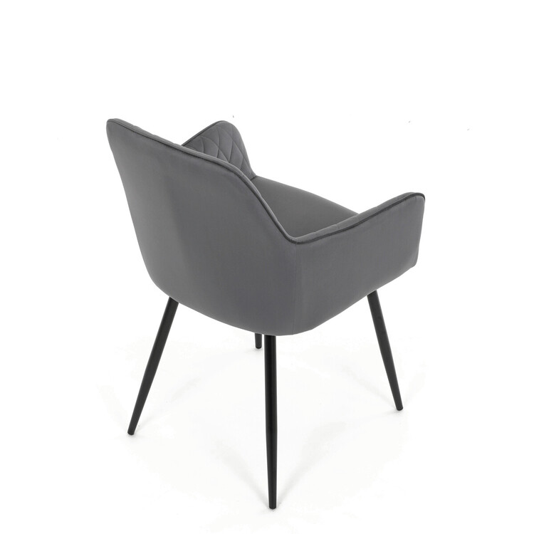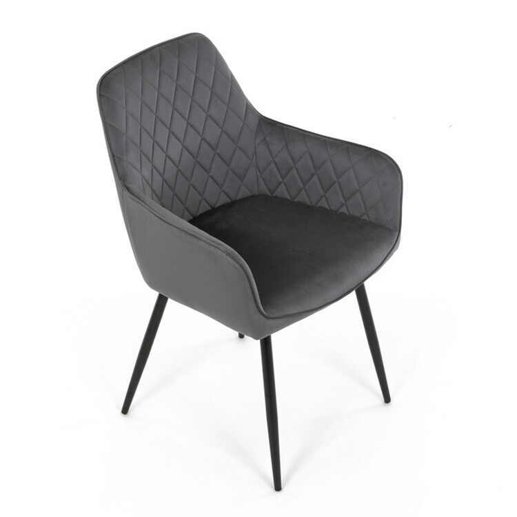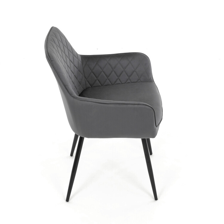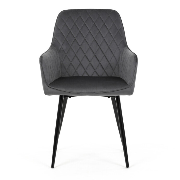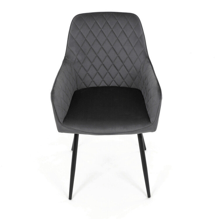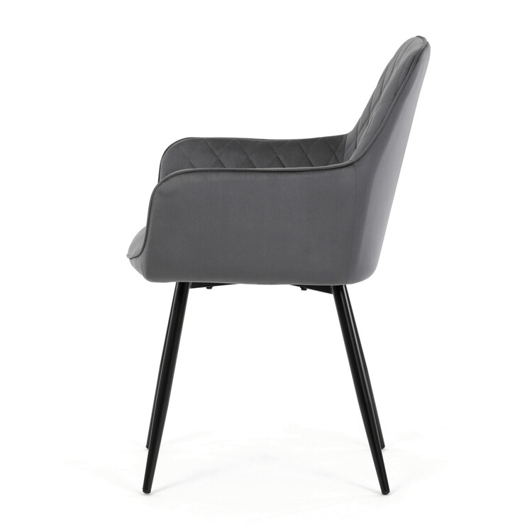 Jídelní židle s potahem z šedé sametové látky nabízí příjemný dotek a vizuálně zajímavý design díky prošívání v kosočtverečném vzoru na opěradle i područkách. Pevné kovové nohy v černém matném provedení zajišťují stabilitu a dlouhou životnost. Ergonomicky tvarované opěradlo s integrovanými područkami podporuje pohodlné sezení během delších jídel i setkání. Sedák je dostatečně široký a vyplněný měkkou výplní, která přispívá k pohodlí. Židle je vhodná do moderních i klasických interiérů, kde vynikne její kombinace sametu a kovu.