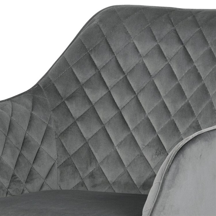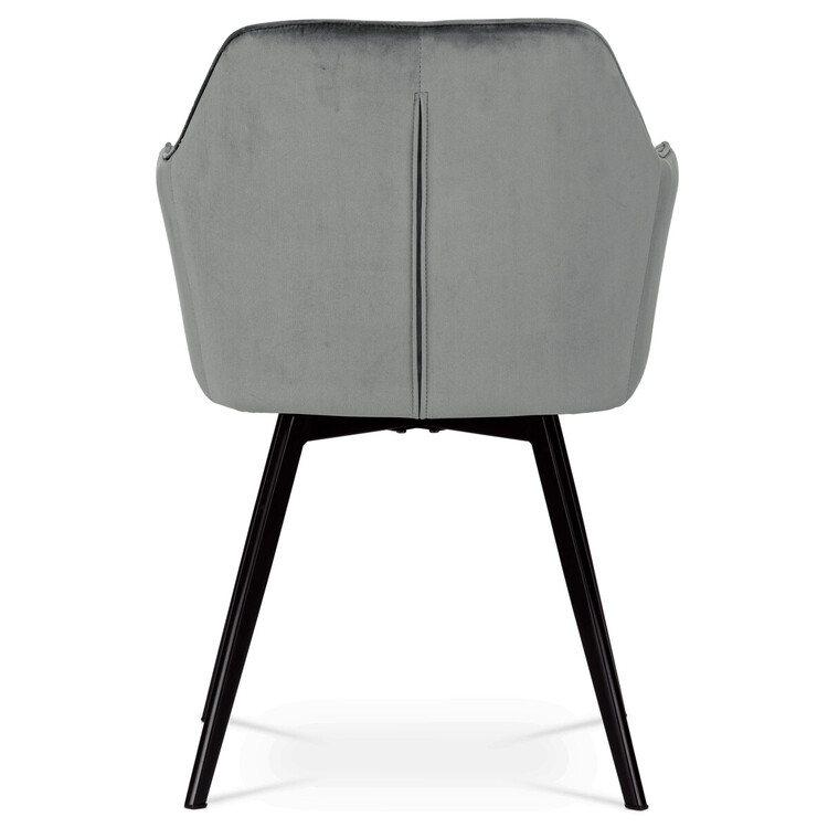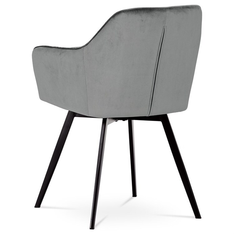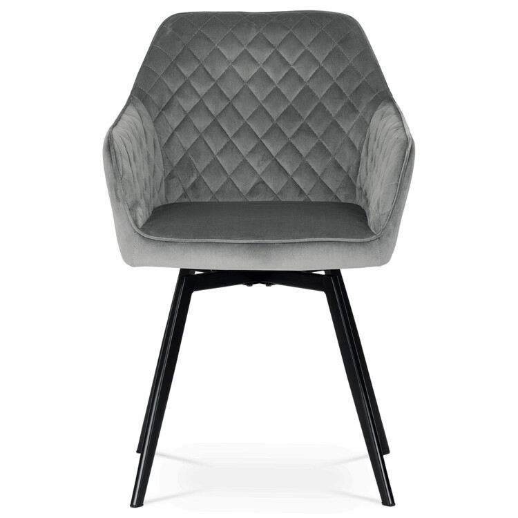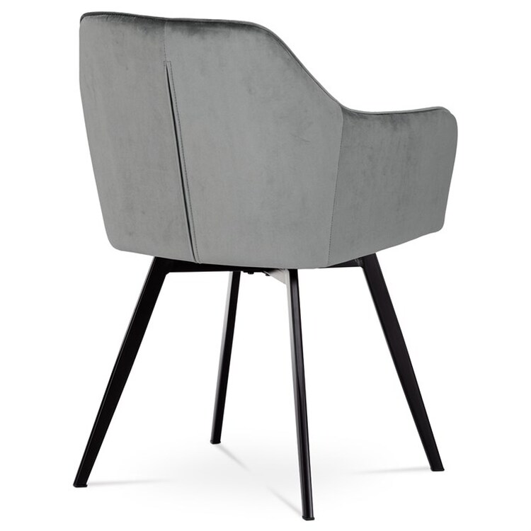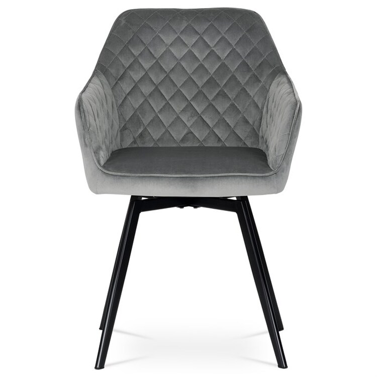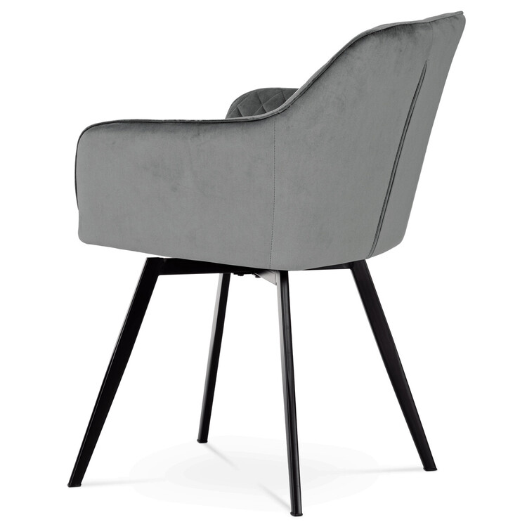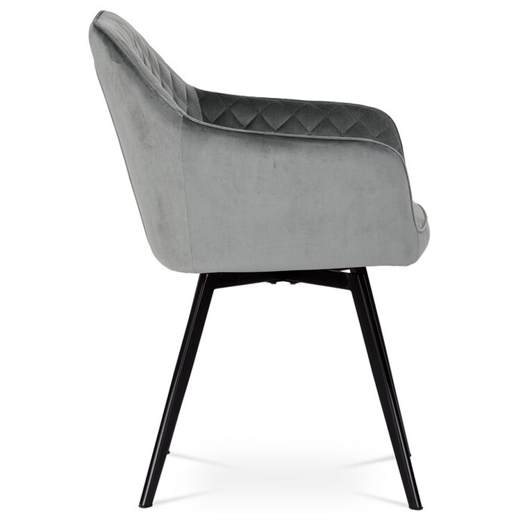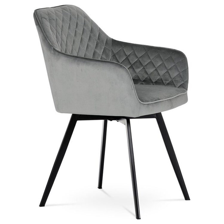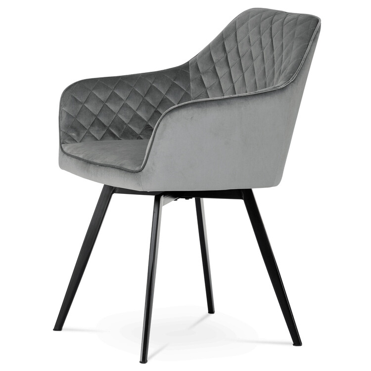 Díky svému dokonalému designu je tato židle v industriálním stylu nezaměnitelná a zároveň velmi pohodlná. Skořepina sedáku a opěradla má potah z kvalitní látky v stříbřitě šedém matném sametu. Polstrování je z PU pěny. Velmi dekorativním prvkem je výrazné kosočtvercové prošití vnitřních ploch v barvě potahu a paspule po obvodu celé skořepiny. Vybraná látka se také velmi dobře čistí. Stabilitu židle zajišťují čtyři kónické kovové nohy obdélníkového průřezu s kvalitním práškovým nástřikem v černé matné barvě. Ukončené jsou černými plastovými kluzáky, zabraňující poškození tvrdých povrchů podlah. Tato provedení produkují z tohoto modelu židle skvělou volbu pro zařízení obývacích či jídelních, ale také zasedacích místností. Nosnost židle je 110 kg.Bonusem této židle je otočný a vratným mechanismus, který umožňuje otáčení o 90° doleva a o 90° doprava a zároveň vždy vrátí sedák do původní polohy. Díky němu žiidle zůstanou vždy srovnané u stolu.