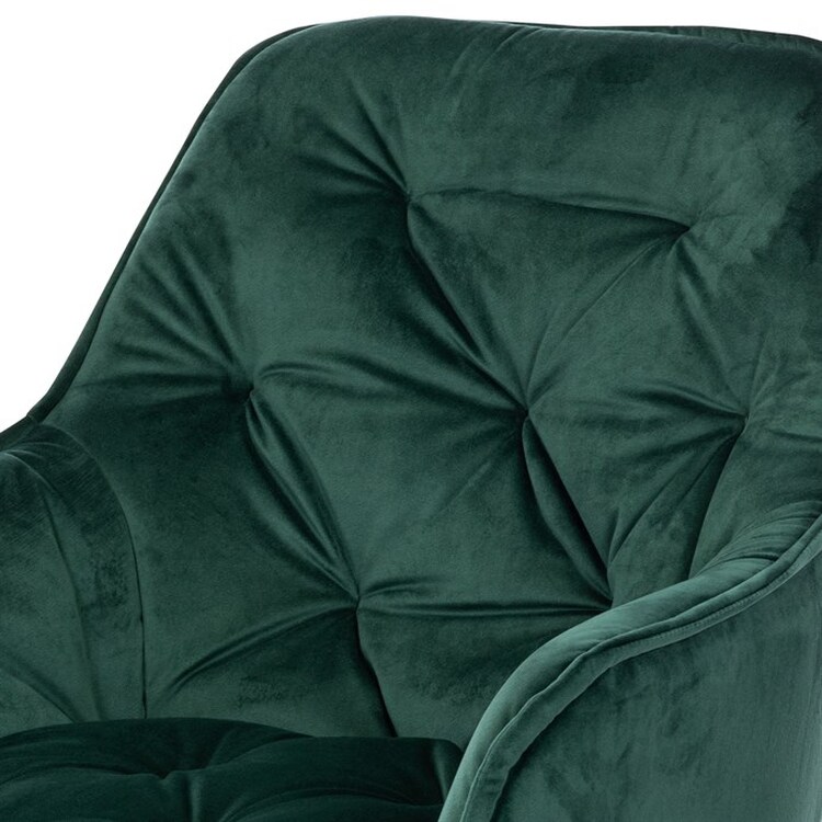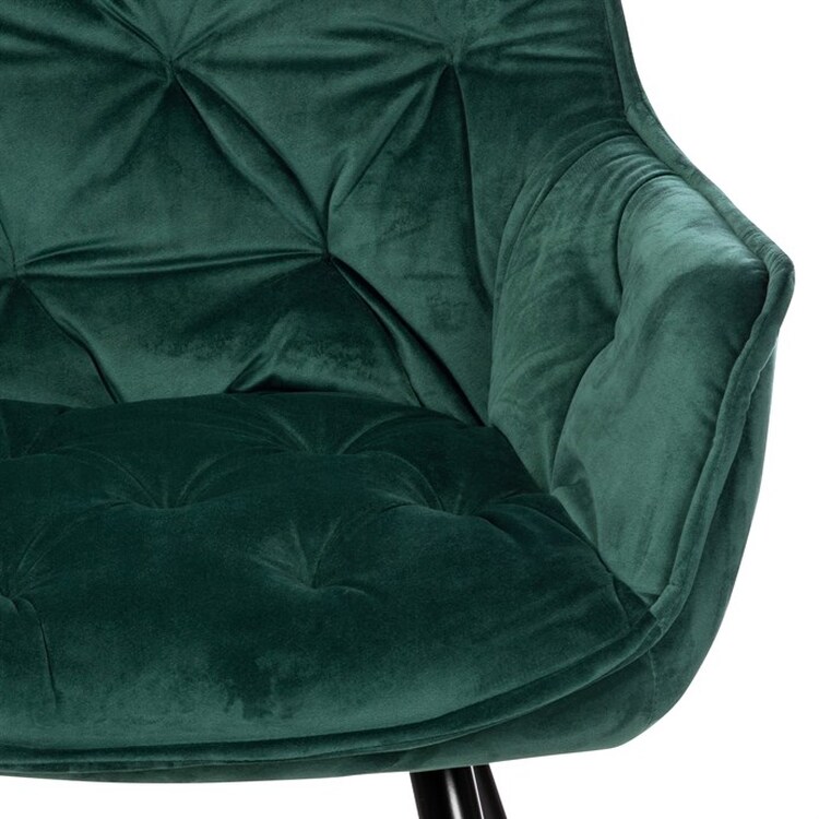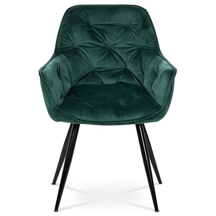 Jídelní židle s označením DCH-421 GRN4 nabízí komfortní sezení díky sametovému potahu v zelené barvě, který je příjemný na dotek a snadno se udržuje. Čalouněné opěradlo a sedák jsou zdobeny designovým prošitím, které dodává židli elegantní vzhled a zároveň zvyšuje její odolnost. Pevná čtyřnohý podnož z kovu s černým lakem zajišťuje stabilitu a dlouhou životnost. Židle je vybavena integrovanými područkami, které podporují pohodlnou pozici při sezení. Díky svým rozměrům a konstrukci je vhodná pro použití v jídelnách i moderně zařízených interiérech.