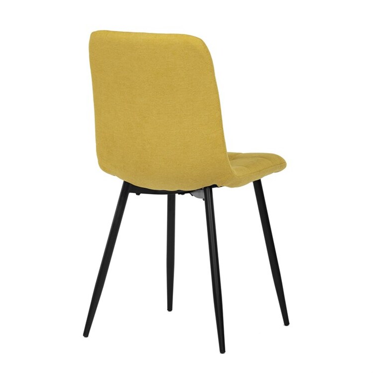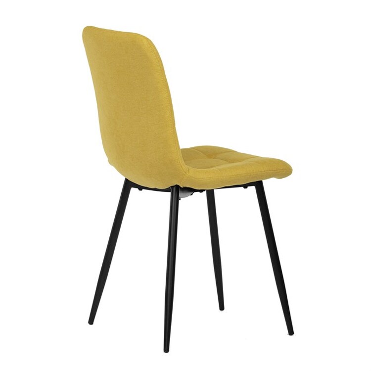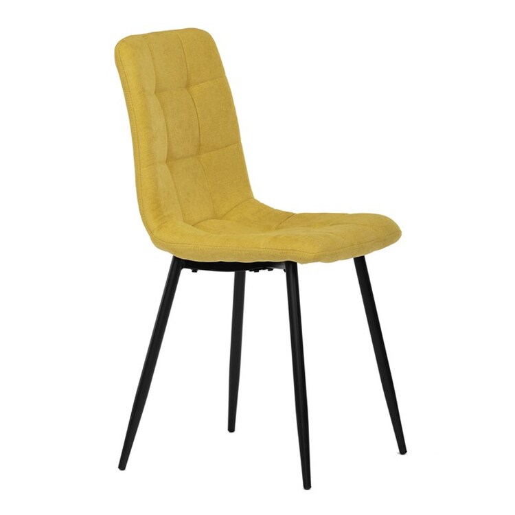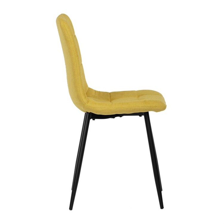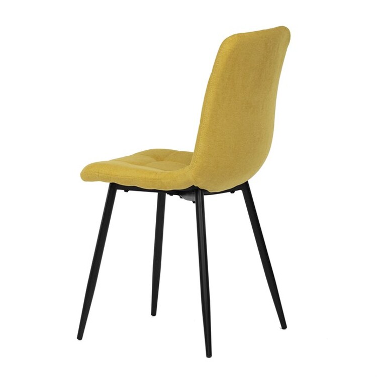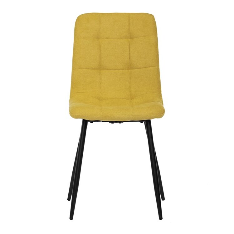 Jídelní židle v industriálním stylu. Potah je z hladké látky ve velmi žádané hořčicově žluté barvě. Výrazné je čtvercové prošití čelních ploch sedáku i opěradla. Polstrování je z kvalitní PU pěny. Stabilitu židle zajišťují čtyři kónické kovové nohy s kvalitním práškovým nástřikem v černé matné barvě. Ukončené jsou černými plastovými kluzáky, zabraňujícími poškození tvrdých povrchů podlah. Nohy jsou kruhového průřezu o nejvyšším průměru 3 cm. Tento minimalistický design jídelních židlí je velmi oblíben pro svoji nadčasovost i pohodlí, které poskytuje. Můžete ji bez obav použít k široké škále stolů v různých materiálech i provedeních.