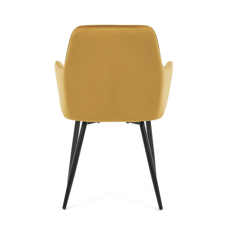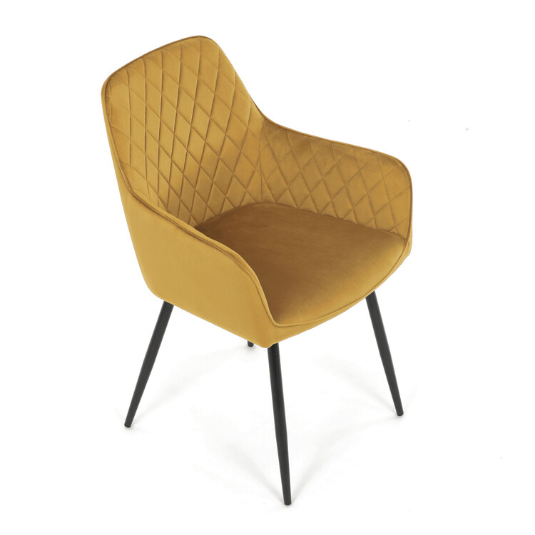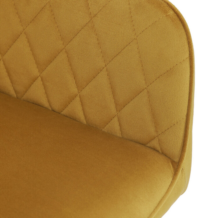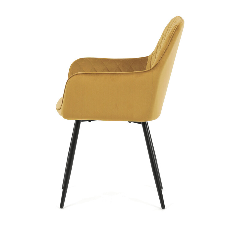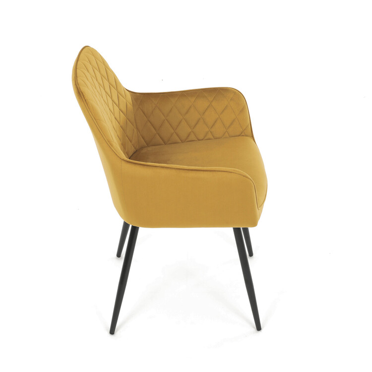 Jídelní židle s označením DCH-215 YEL4 nabízí pohodlné sezení díky čalounění z měkké žluté sametové látky, která je doplněna designovým prošitím v kosočtverečném vzoru na opěradle a područkách. Pevné kovové nohy v černém matném provedení zajišťují stabilitu a dlouhou životnost židle. Ergonomicky tvarované opěradlo s integrovanými područkami podporuje správné držení těla během stolování. Sametová látka je příjemná na dotek a snadno se udržuje, což přispívá k praktickému využití v domácnostech i komerčních prostorách. Židle není otočná, její jednoduchý a zároveň stylový design ji předurčuje k využití v moderních interiérech.