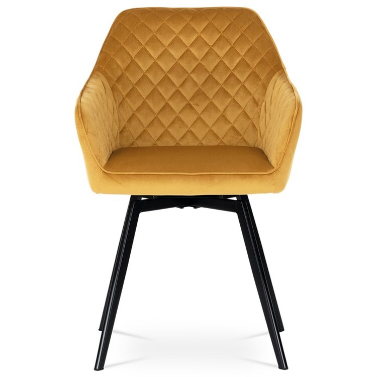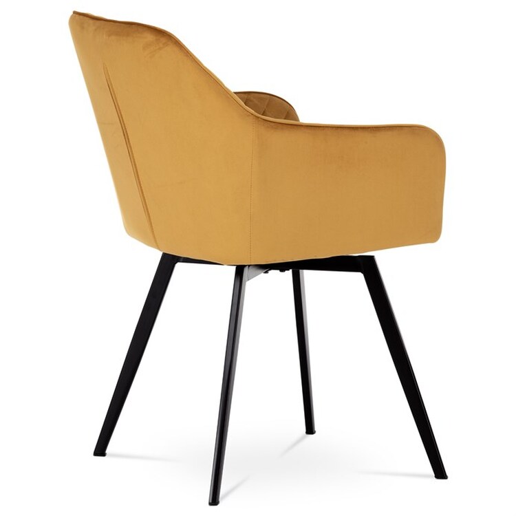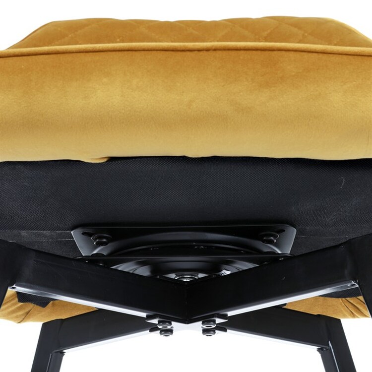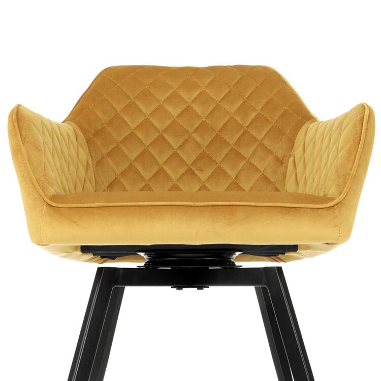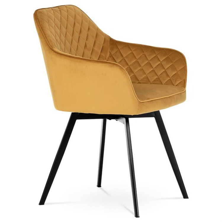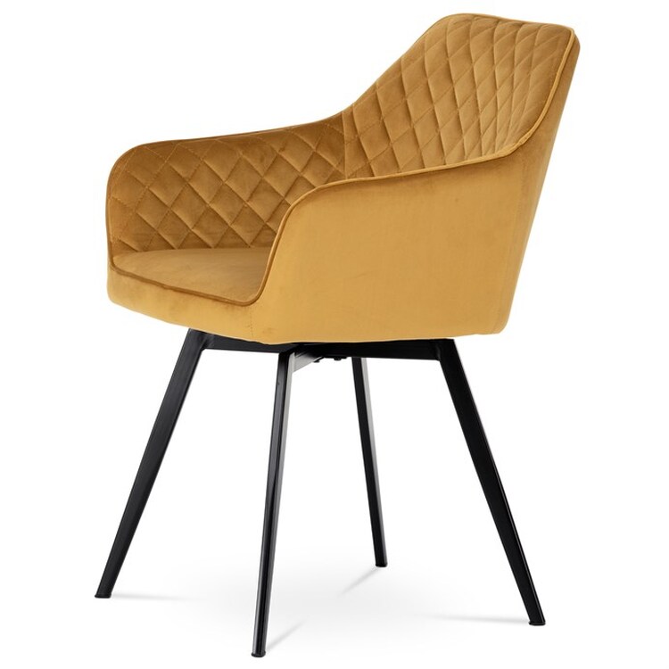 Díky svému dokonalému designu je tato židle v industriálním stylu nezaměnitelná a zároveň velmi pohodlná. Skořepina sedáku a opěráku má potah z kvalitní látky v trendy hořčicově žlutém matném sametu. Polstrování je z PU pěny. Velmi dekorativním prvkem je výrazné kosočtvercové prošití vnitřních ploch v barvě potahu a paspule po obvodu celé skořepiny. Vybraná látka se také velmi dobře čistí. Stabilitu židle zajišťují čtyři kónické kovové nohy obdélníkového průřezu s kvalitním práškovým nástřikem v černé matné barvě. Ukončené jsou černými plastovými kluzáky, zabraňující poškození tvrdých povrchů podlah. Tato provedení produkují z tohoto modelu židle skvělou volbu pro zařízení obývacích či jídelních, ale také zasedacích místností. Nosnost židle je 110 kg.Bonusem této židle je otočný a vratným mechanismus, který umožňuje otáčení o 90° doleva a o 90° doprava a zároveň vždy vrátí sedák do původní polohy. Díky němu žiidle zůstanou vždy srovnané u stolu.