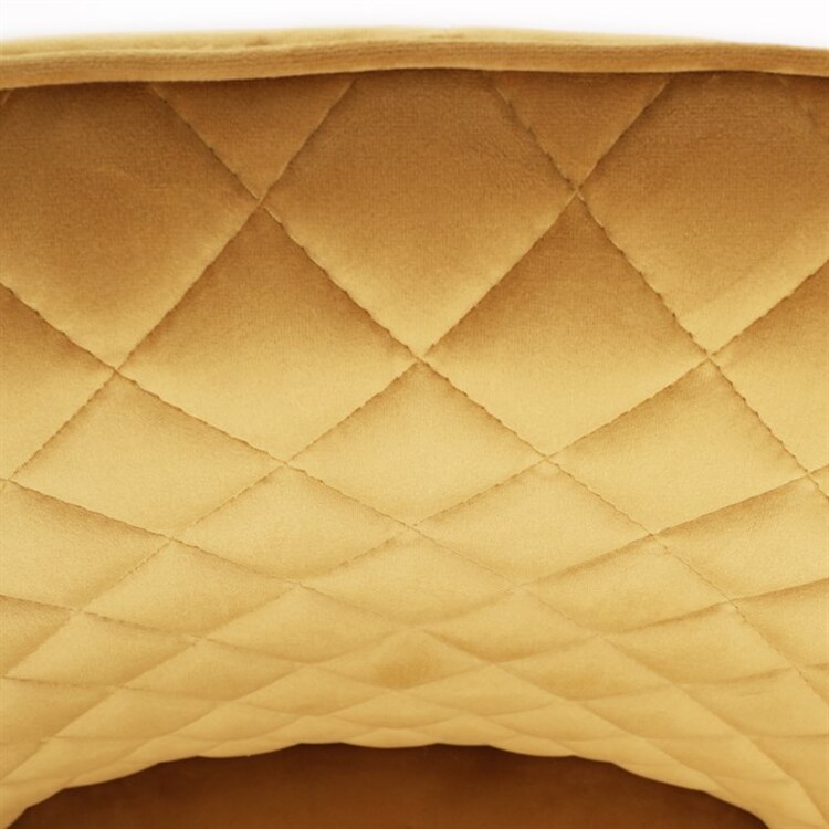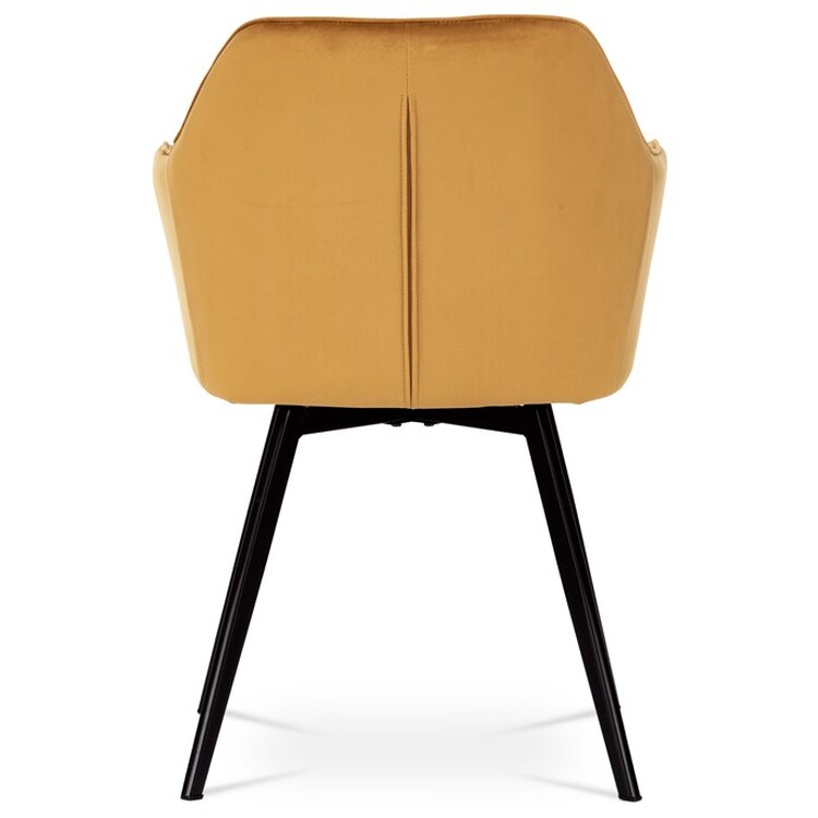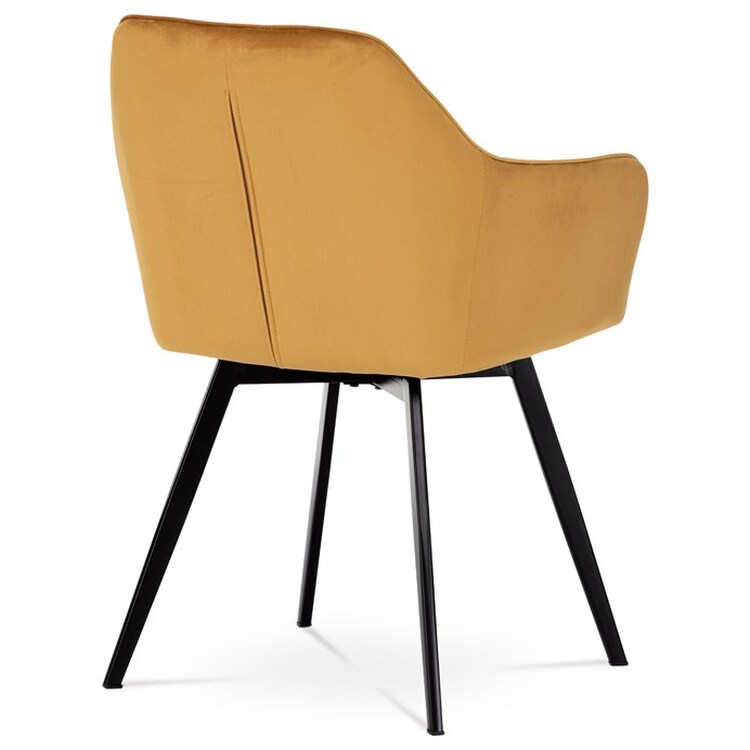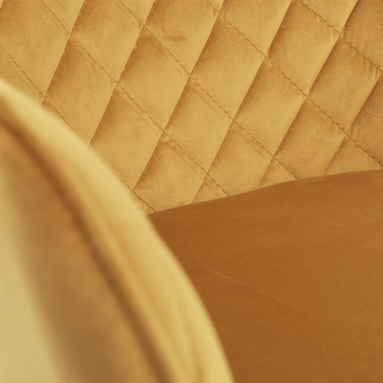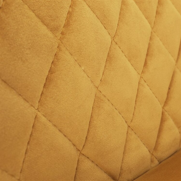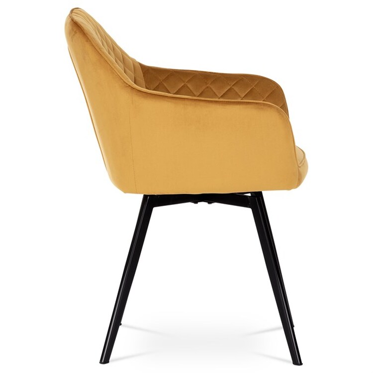 Díky svému dokonalému designu je tato židle v industriálním stylu nezaměnitelná a zároveň velmi pohodlná. Skořepina sedáku a opěráku má potah z kvalitní látky v trendy hořčicově žlutém matném sametu. Polstrování je z PU pěny. Velmi dekorativním prvkem je výrazné kosočtvercové prošití vnitřních ploch v barvě potahu a paspule po obvodu celé skořepiny. Vybraná látka se také velmi dobře čistí. Stabilitu židle zajišťují čtyři kónické kovové nohy obdélníkového průřezu s kvalitním práškovým nástřikem v černé matné barvě. Ukončené jsou černými plastovými kluzáky, zabraňující poškození tvrdých povrchů podlah. Tato provedení produkují z tohoto modelu židle skvělou volbu pro zařízení obývacích či jídelních, ale také zasedacích místností. Nosnost židle je 110 kg.Bonusem této židle je otočný a vratným mechanismus, který umožňuje otáčení o 90° doleva a o 90° doprava a zároveň vždy vrátí sedák do původní polohy. Díky němu žiidle zůstanou vždy srovnané u stolu.
