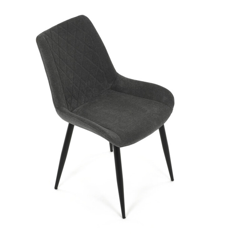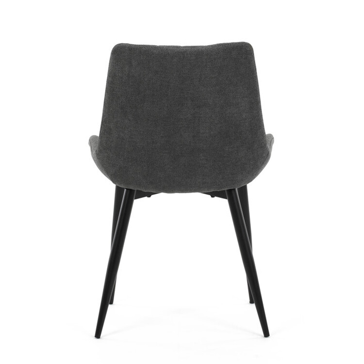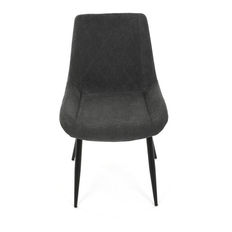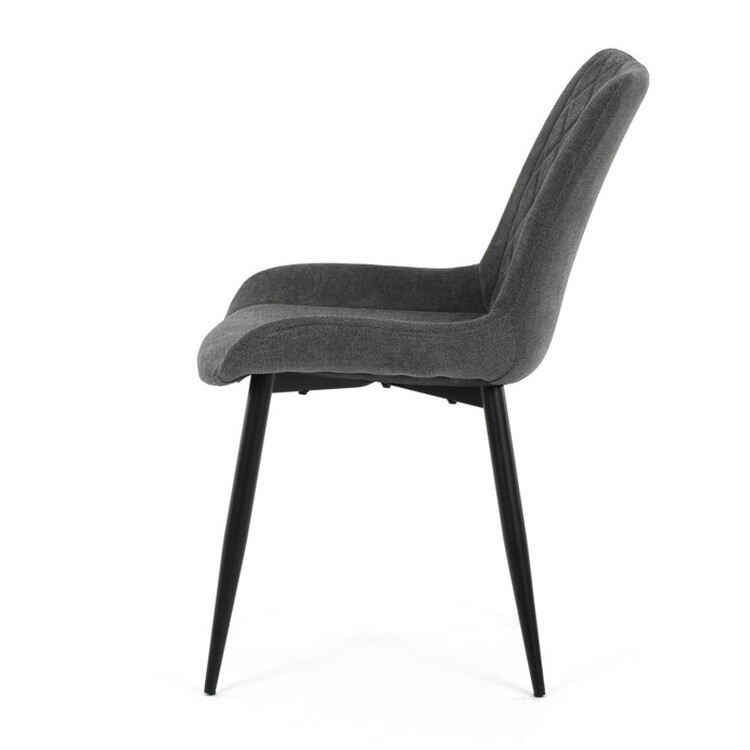 Jídelní židle s čalouněním v šedé látce nabízí pohodlné sezení díky ergonomicky tvarovanému sedáku a opěradlu s designovým prošitím, které zároveň dodává moderní vzhled. Pevná kovová podnož v černém provedení zajišťuje stabilitu a dlouhou životnost. Absence područek umožňuje snadné zasunutí židle pod stůl a šetří prostor v jídelně. Židle je vhodná pro každodenní použití v domácnostech i komerčních prostorách. Její jednoduchý, ale stylový design se snadno kombinuje s různými interiérovými styly.