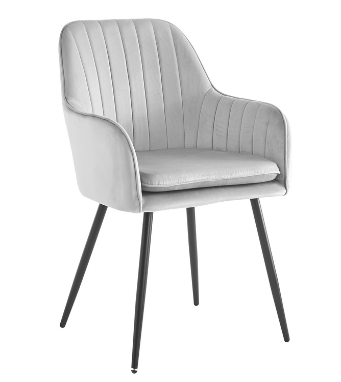 Elegantní čalouněná židle, křeslo s ergonomickým tvarem. Kovová konstrukce černé barvy, čalounění sedáku s prošitím je v látce velvet šedý. Výška sedu je 50 cm. Židle se hodí ke stolům, které naleznete v naší uvedené nabídce. Dodáváme v demontovaném stavu.CASA 95148