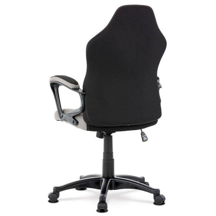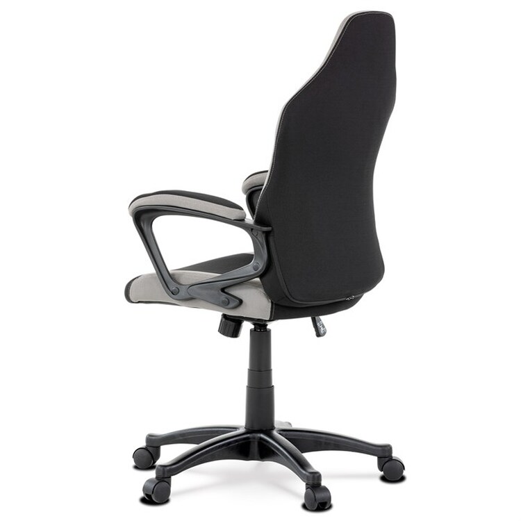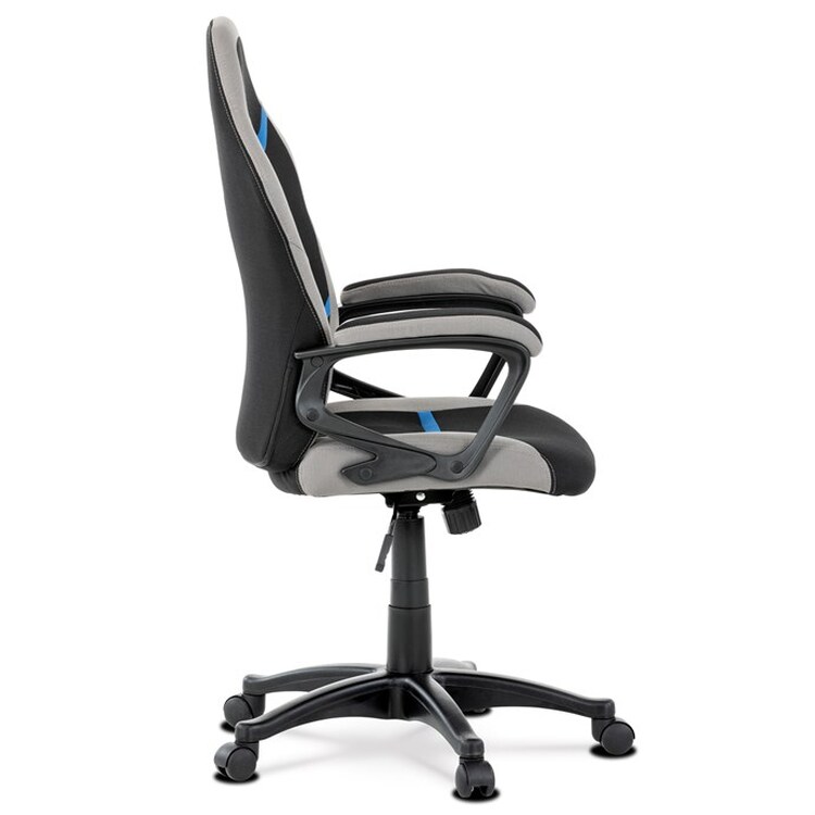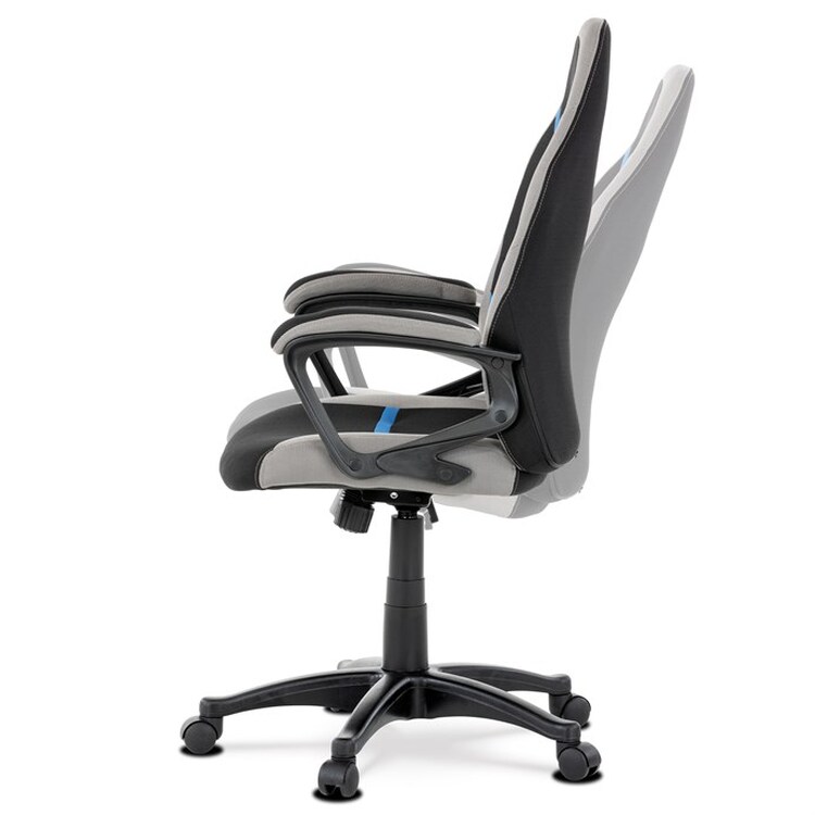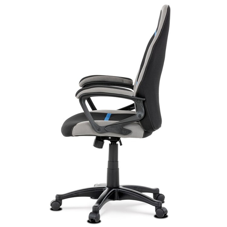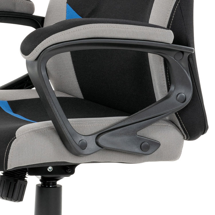 Elegantní kancelářská i herní židle se zaoblenými liniemi, obvodovým prošitím v šedé barvě a výrazným tvarovým prošitím sedáku i opěráku.Potah je kombinací černé a světle šedé látky hladké látky s decentním modrým detailem na opěráku i sedáku. Polstrování je z kvalitní PU pěny. Židle je vybavena houpacím mechanismem s nastavením protiváhy a aretací v základní poloze. Tuhost protiváhy lze regulovat velkým plastovým šroubem, umístěným pod sedákem. Výška sezení se upravuje páčkou na pravé straně přes kvalitní plynový píst. Znavené ruce si velice pohodlně položíte na plastové područky, na ložné ploše polstrované černou a šedou látkou. Šíře područek je úžasných 7,5 cm, ložná plocha 31 cm a výška 3 cm. Opěrák je vyšší, částečně prodyšný a s integrovanou statickou opěrkou hlavy. Zvýšené okraje sedáku i opěráku podporují správné držení těla i páteře a slouží jako výborná opora. Kříž je černý plastový o průměru je 65 cm, což zajišťuje výbornou stabilitu i u fyzicky náročnějších her. Kolečka jsou plastová pr. 5 cm. Nosnost židle je až 120 kg.