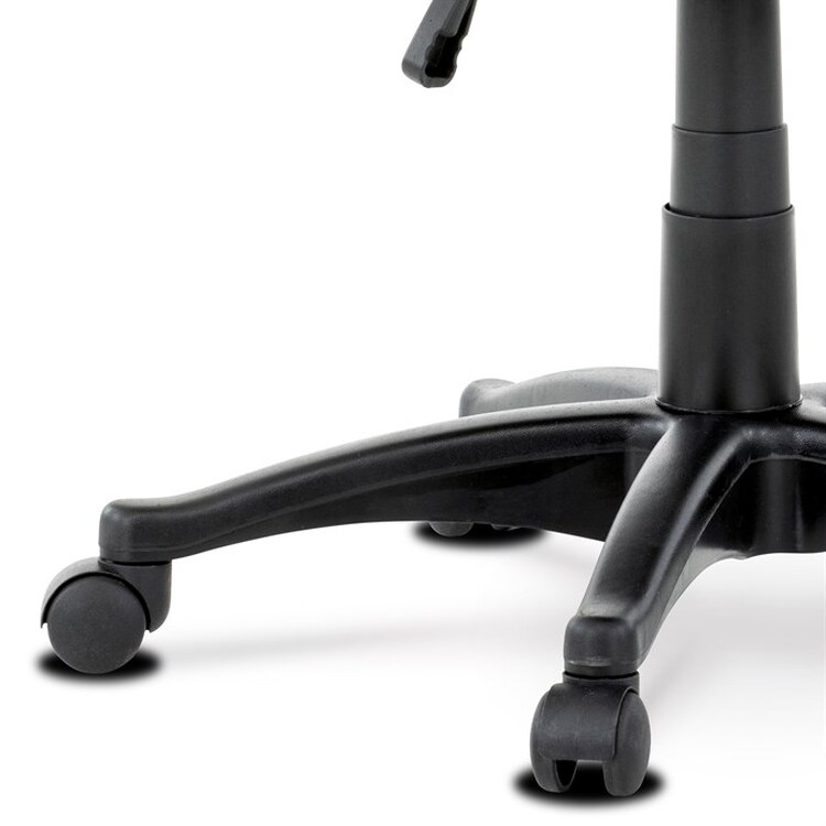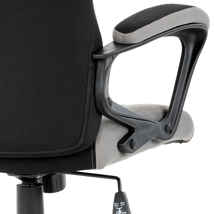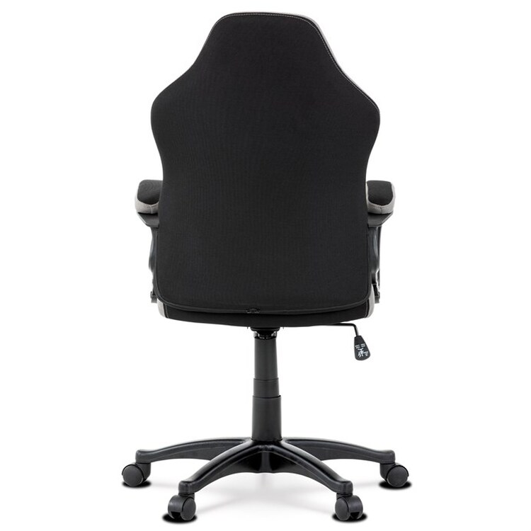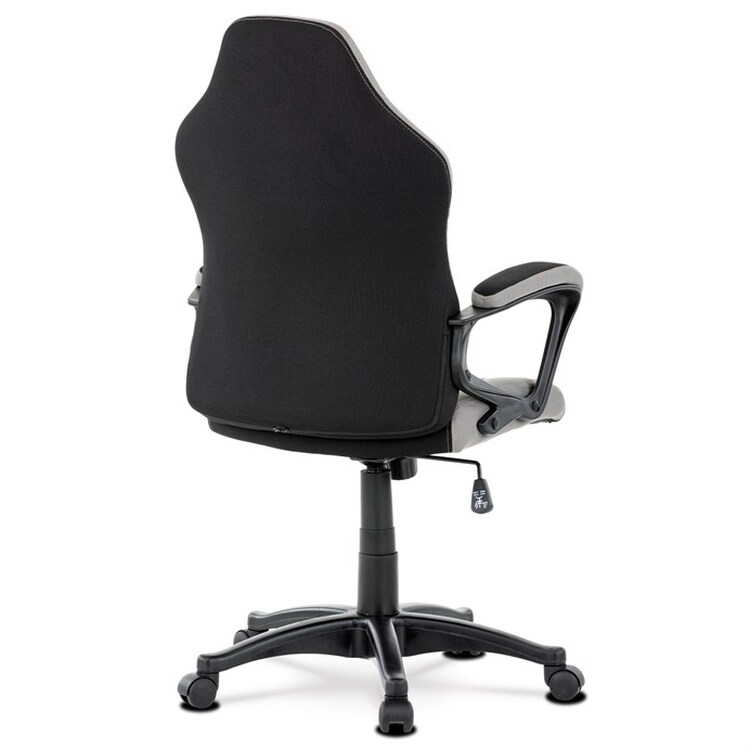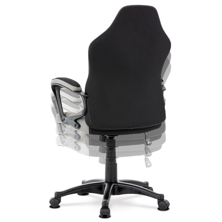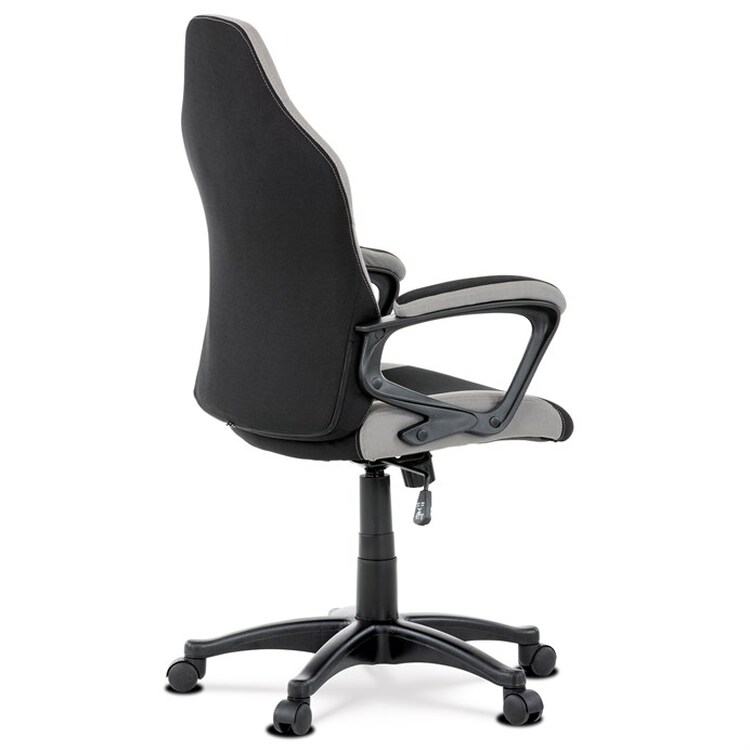Elegantní kancelářská i herní židle se zaoblenými liniemi, obvodovým prošitím v šedé barvě a výrazným tvarovým prošitím sedáku i opěráku.Potah je kombinací černé a světle šedé látky hladké látky s decentním modrým detailem na opěráku i sedáku. Polstrování je z kvalitní PU pěny. Židle je vybavena houpacím mechanismem s nastavením protiváhy a aretací v základní poloze. Tuhost protiváhy lze regulovat velkým plastovým šroubem, umístěným pod sedákem. Výška sezení se upravuje páčkou na pravé straně přes kvalitní plynový píst. Znavené ruce si velice pohodlně položíte na plastové područky, na ložné ploše polstrované černou a šedou látkou. Šíře područek je úžasných 7,5 cm, ložná plocha 31 cm a výška 3 cm. Opěrák je vyšší, částečně prodyšný a s integrovanou statickou opěrkou hlavy. Zvýšené okraje sedáku i opěráku podporují správné držení těla i páteře a slouží jako výborná opora. Kříž je černý plastový o průměru je 65 cm, což zajišťuje výbornou stabilitu i u fyzicky náročnějších her. Kolečka jsou plastová pr. 5 cm. Nosnost židle je až 120 kg.