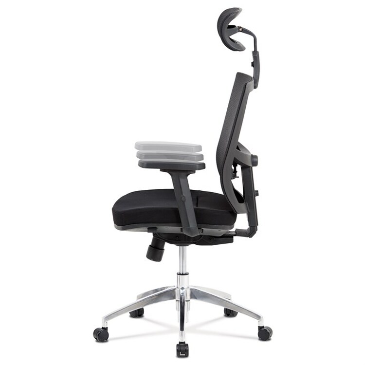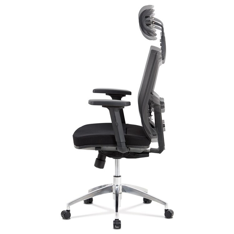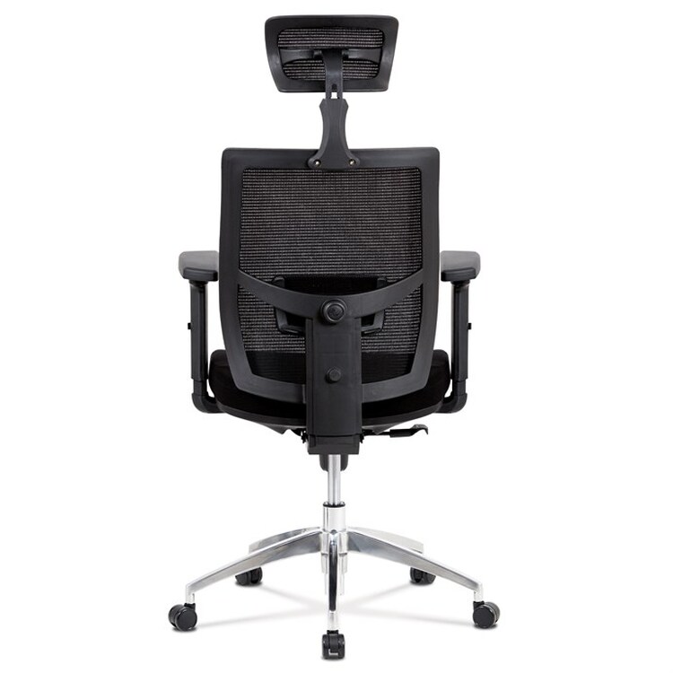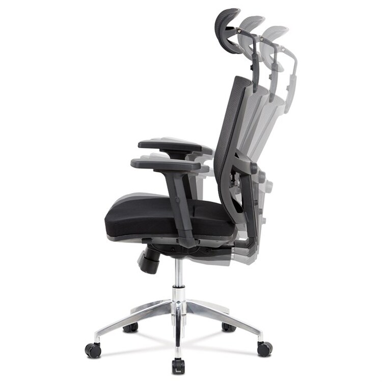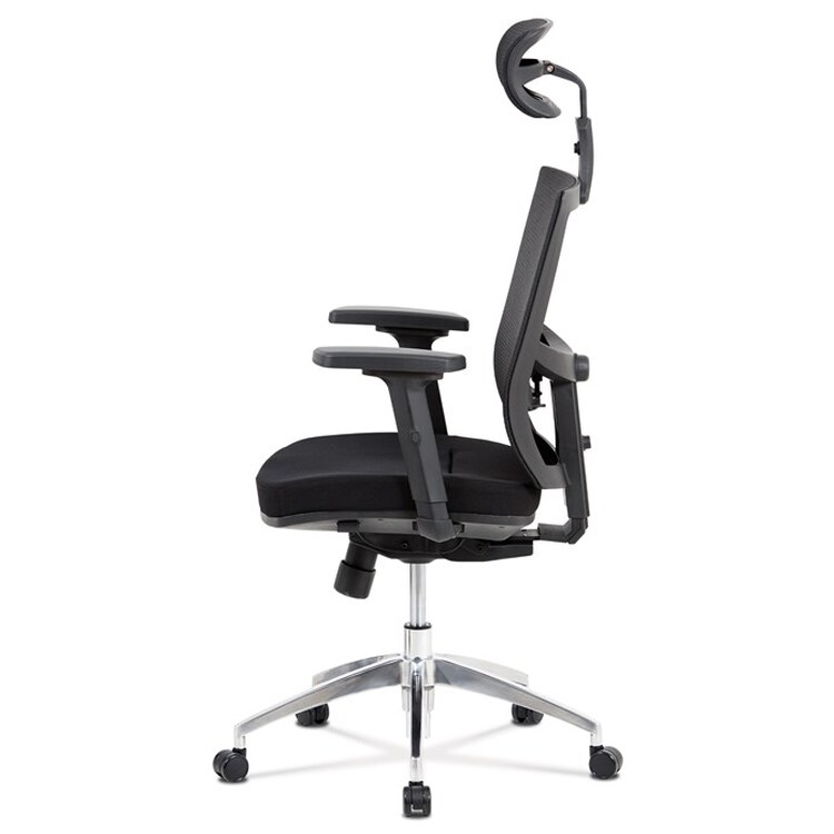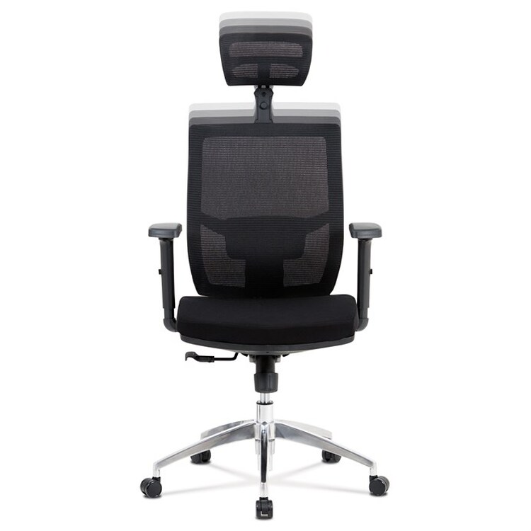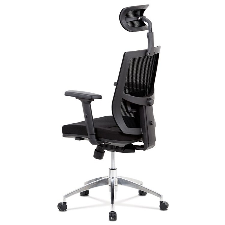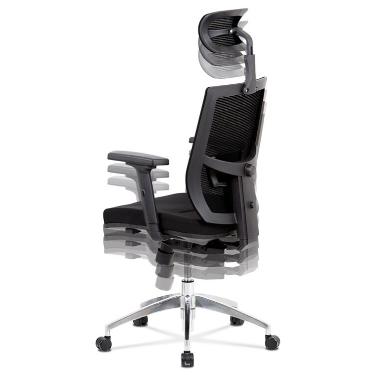 Kancelářská židle s opěrákem z černé síťoviny MESH a černým látkovým sedákem. Židle je výškově nastavitelná, vybavená synchronním mechanismem. Plastové područky jsou polohovací a výškově nastavitelné (2D). Výškově nastavitelný je i opěrák. Díky malé páčce můžete samostatně polohovat sedák dopředu nebo dozadu. Síťovaná, výškově nastavitelná a polohovací opěrka hlavy a nastavitelná bederní opěrka. Kříž z leštěného hliníku s kolečky vhodnými na tvrdé typy podlah.