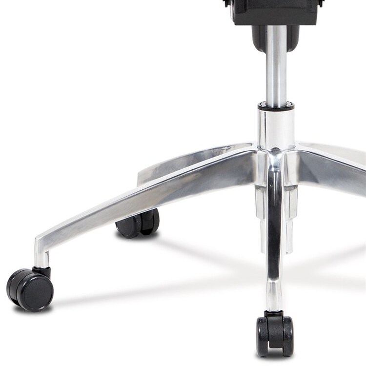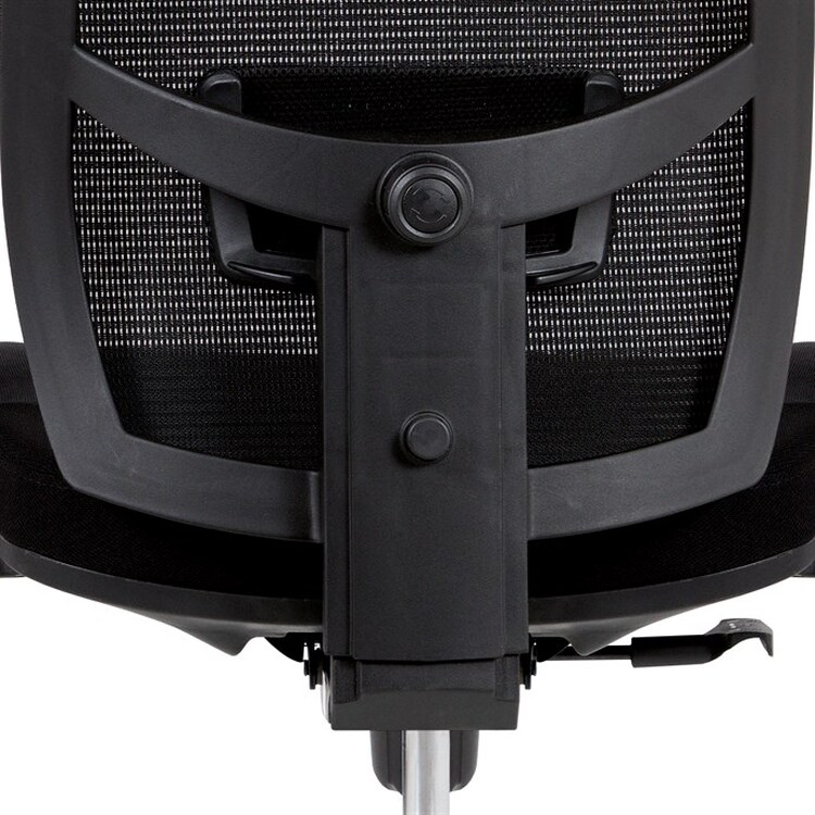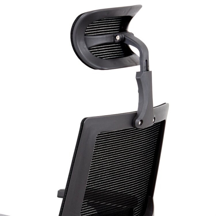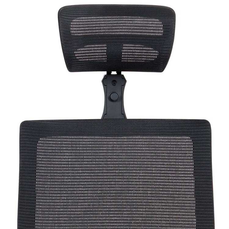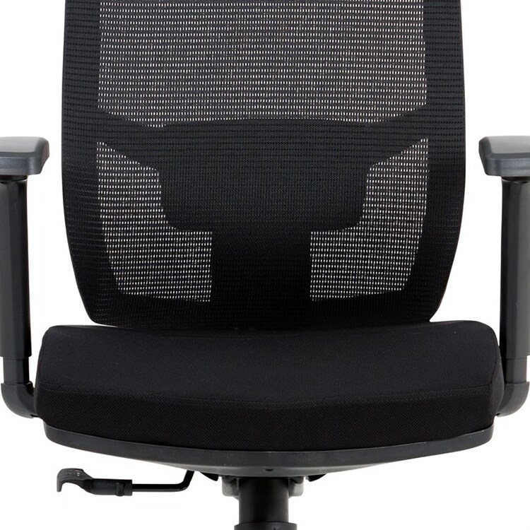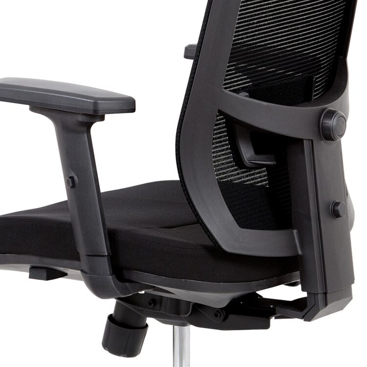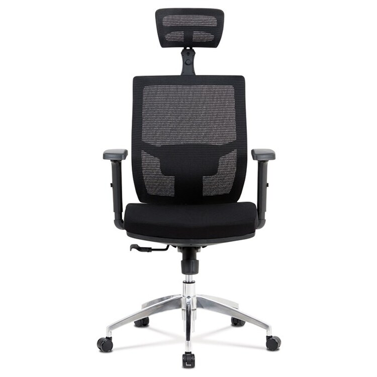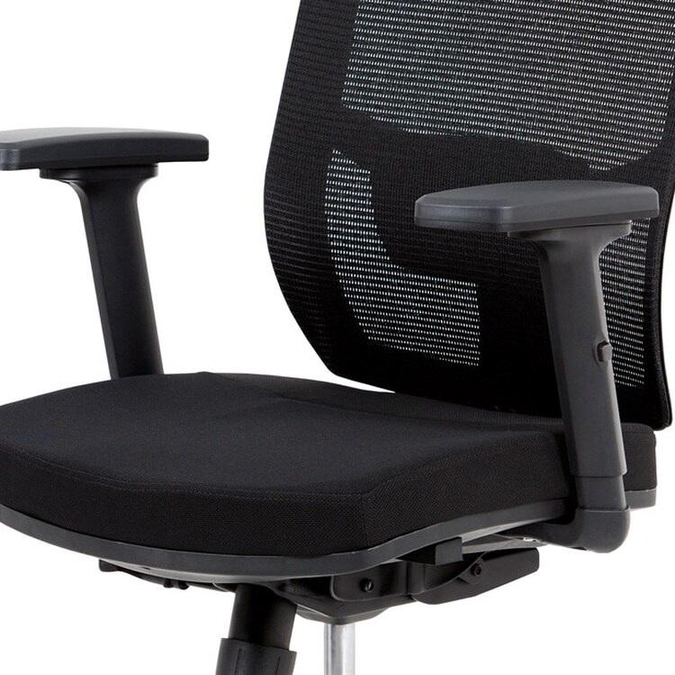 Kancelářská židle s opěrákem z černé síťoviny MESH a černým látkovým sedákem. Židle je výškově nastavitelná, vybavená synchronním mechanismem. Plastové područky jsou polohovací a výškově nastavitelné (2D). Výškově nastavitelný je i opěrák. Díky malé páčce můžete samostatně polohovat sedák dopředu nebo dozadu. Síťovaná, výškově nastavitelná a polohovací opěrka hlavy a nastavitelná bederní opěrka. Kříž z leštěného hliníku s kolečky vhodnými na tvrdé typy podlah.