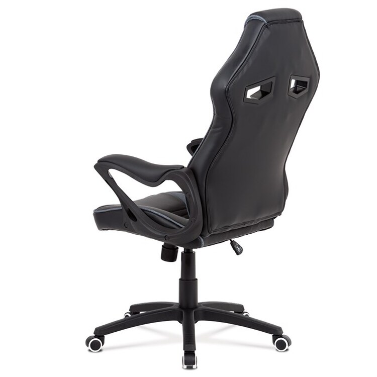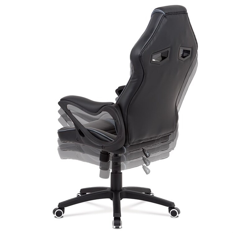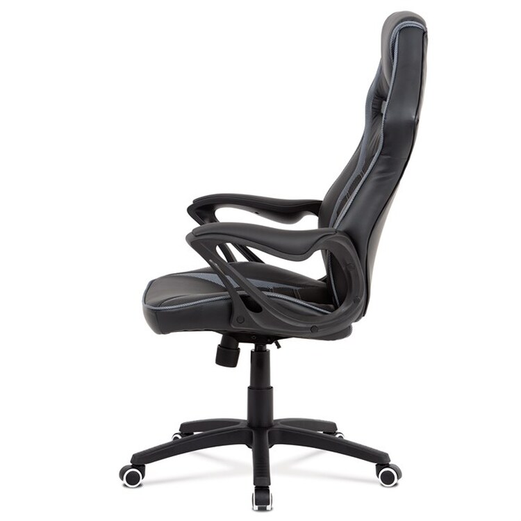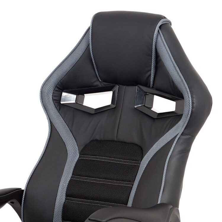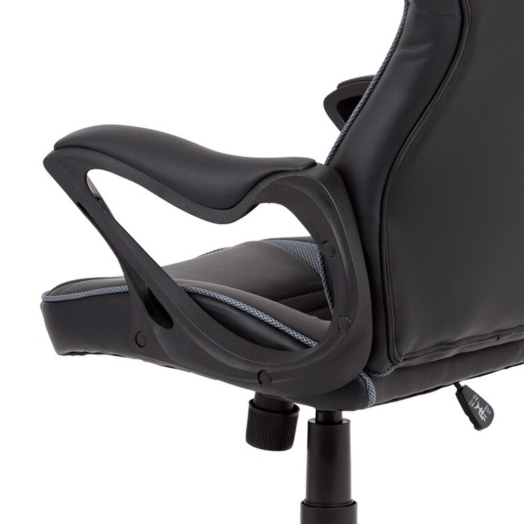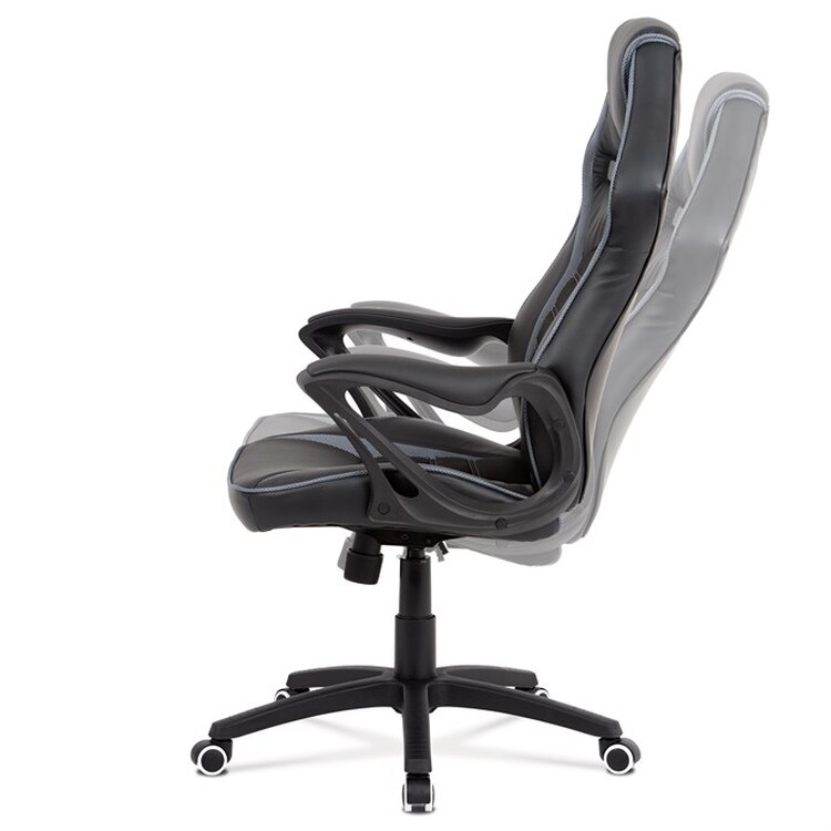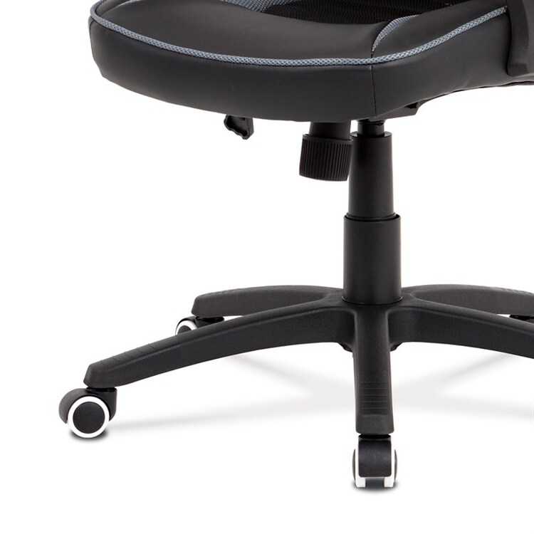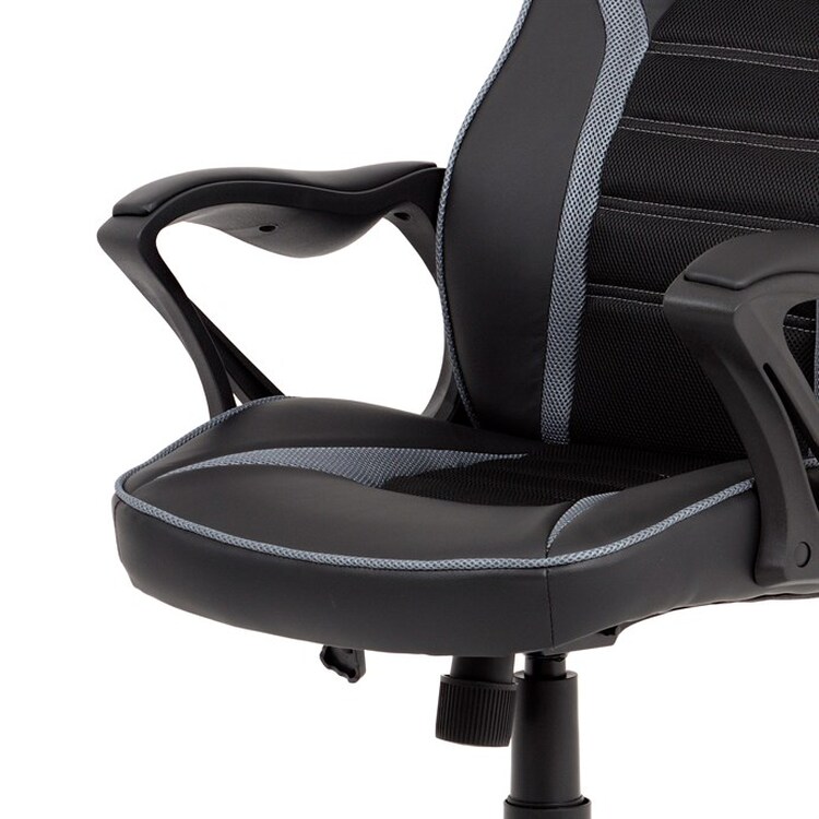 Kancelářská židle KA-G406 GREY kombinuje černou ekokůži s šedou látkou MESH, což zajišťuje příjemný komfort a moderní vzhled. Ergonomicky tvarované opěradlo podporuje správné držení těla, zatímco vyměkčená vrchní část sedáku přispívá k pohodlnému sezení i při delším používání. Židle je vybavena pevnými čalouněnými područky a stabilním plastovým křížem s kolečky vhodnými pro tvrdé povrchy. Houpací mechanismus umožňuje mírné naklánění pro uvolnění během práce. Celková konstrukce je navržena pro dlouhou životnost a nosnost odpovídající běžnému kancelářskému využití.